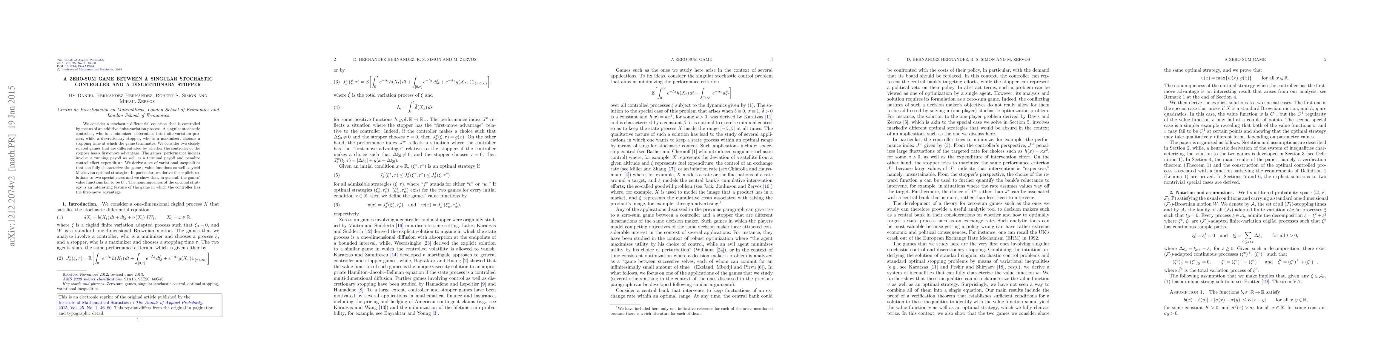 This paper studies a zero-sum game between a singular stochastic controller and a discretionary stopper within a stochastic differential equation framework. The controller minimizes control effort while the stopper maximizes payoff, with performance indices involving both running and terminal payoffs. The authors derive variational inequalities to characterize the games' value functions and find that the optimal strategies are not always unique, especially when the controller has a first-move advantage.
