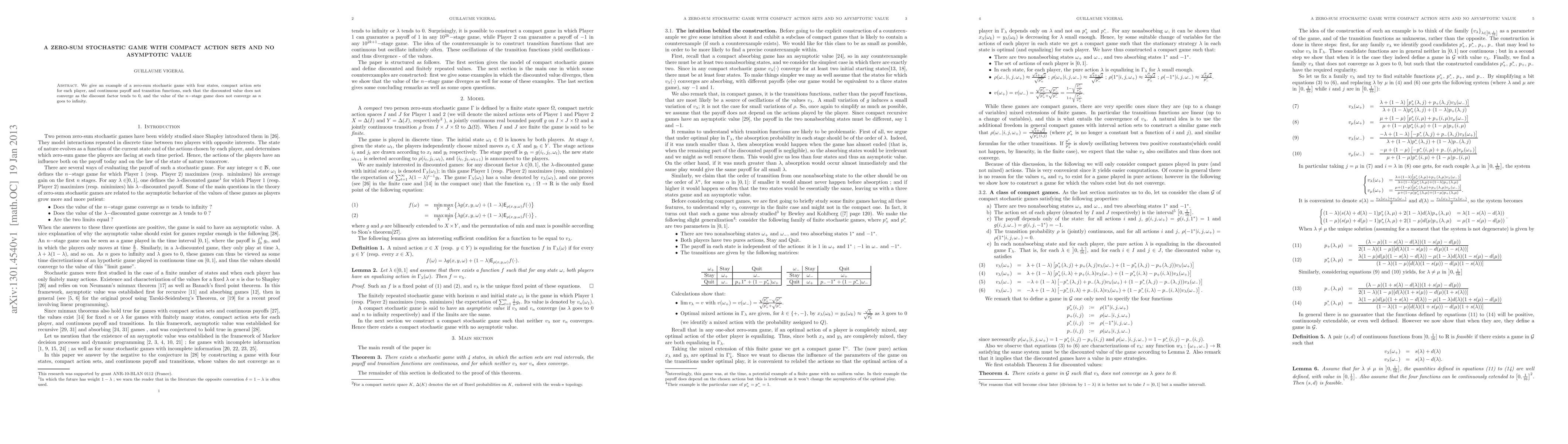 We give an example of a zero-sum stochastic game with four states, compact action sets for each player, and continuous payoff and transition functions, such that the discounted value does not converge as the discount factor tends to 0, and the value of the n-stage game does not converge as n goes to infinity.