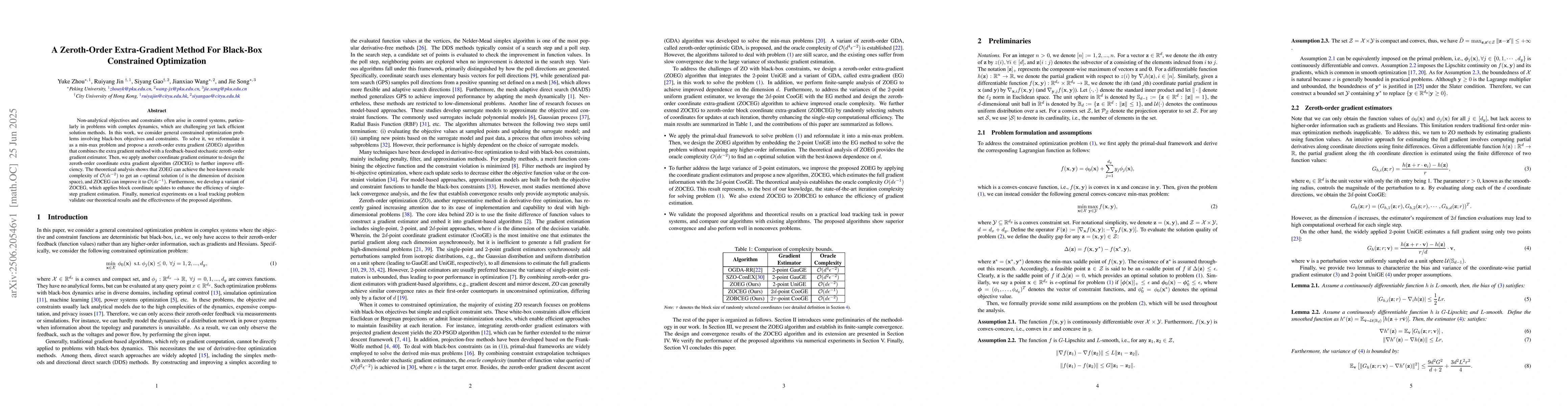 Non-analytical objectives and constraints often arise in control systems, particularly in problems with complex dynamics, which are challenging yet lack efficient solution methods. In this work, we consider general constrained optimization problems involving black-box objectives and constraints. To solve it, we reformulate it as a min-max problem and propose a zeroth-order extra gradient (ZOEG) algorithm that combines the extra gradient method with a feedback-based stochastic zeroth-order gradient estimator. Then, we apply another coordinate gradient estimator to design the zeroth-order coordinate extra gradient algorithm (ZOCEG) to further improve efficiency. The theoretical analysis shows that ZOEG can achieve the best-known oracle complexity of $\mathcal{O}(d\epsilon^{-2})$ to get an $\epsilon$-optimal solution ($d$ is the dimension of decision space), and ZOCEG can improve it to $\mathcal{O}(d\epsilon^{-1})$. Furthermore, we develop a variant of ZOCEG, which applies block coordinate updates to enhance the efficiency of single-step gradient estimation. Finally, numerical experiments on a load tracking problem validate our theoretical results and the effectiveness of the proposed algorithms.
