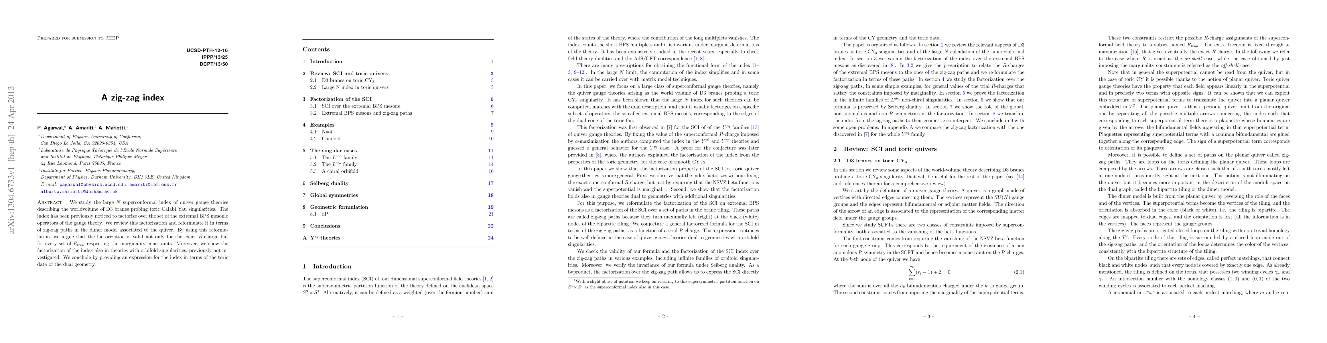 We study the large N superconformal index of quiver gauge theories describing the worldvolume of D3 branes probing toric Calabi Yau singularities. The index has been previously noticed to factorize over the set of the extremal BPS mesonic operators of the gauge theory. We review this factorization and reformulate it in terms of zig-zag paths in the dimer model associated to the quiver. By using this reformulation, we argue that the factorization is valid not only for the exact R charge but for every set of R_{trial} respecting the marginality constraints. Moreover, we show the factorization of the index also in theories with orbifold singularities, previously not investigated. We conclude by providing an expression for the index in terms of the toric data of the dual geometry.