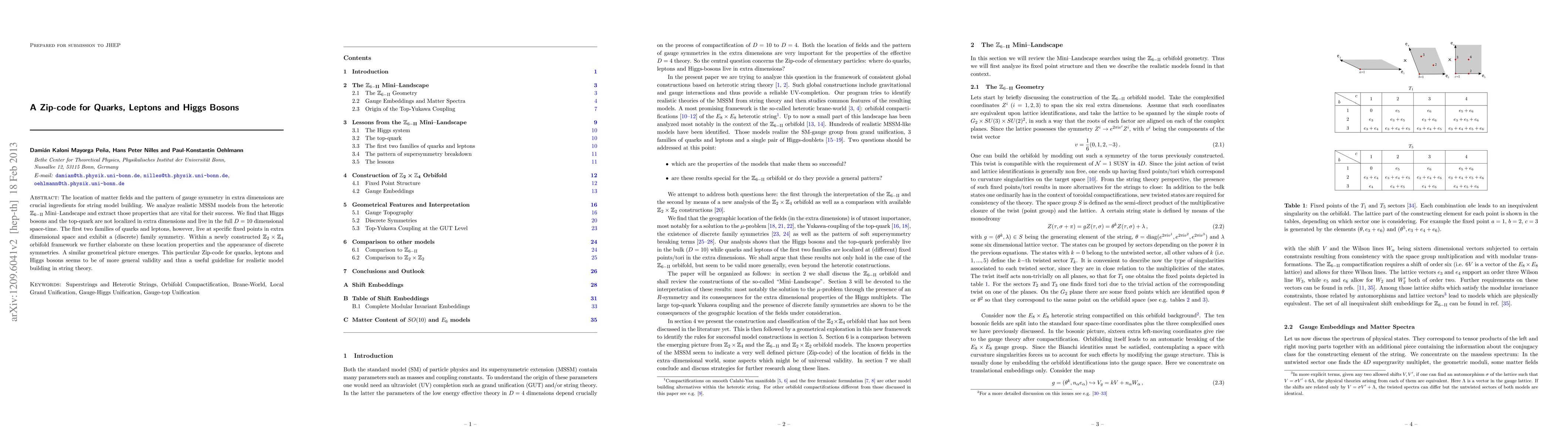 The location of matter fields and the pattern of gauge symmetry in extra dimensions are crucial ingredients for string model building. We analyze realistic MSSM models from the heterotic Z6 Mini-Landscape and extract those properties that are vital for their success. We find that Higgs bosons and the top quark are not localized in extra dimensions and live in the full D=10 dimensional space-time. The first two families of quarks and leptons, however, live at specific fixed points in extra dimensional space and exhibit a (discrete) family symmetry. Within a newly constructed Z2XZ4 orbifold framework we further elaborate on these location properties and the appearance of discrete symmetries. A similar geometrical picture emerges. This particular Zip-code for quarks, leptons and Higgs bosons seems to be of more general validity and thus a useful guideline for realistic model building in string theory.