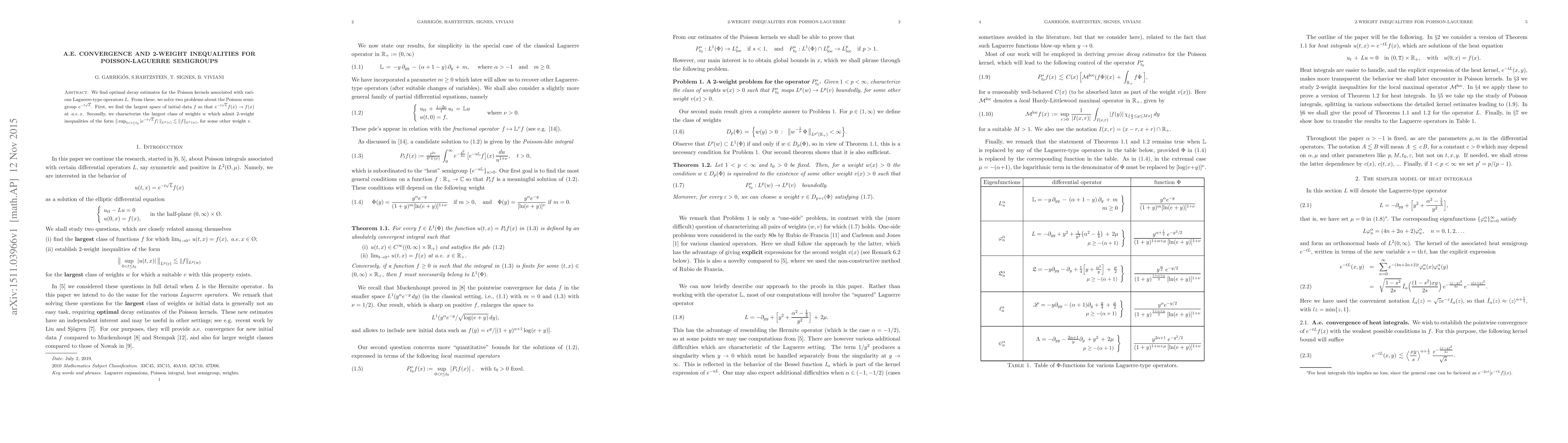 This paper investigates decay estimates for Poisson-Laguerre semigroups, finding optimal bounds for initial data convergence and 2-weight inequalities, with implications for understanding the properties of these operators.