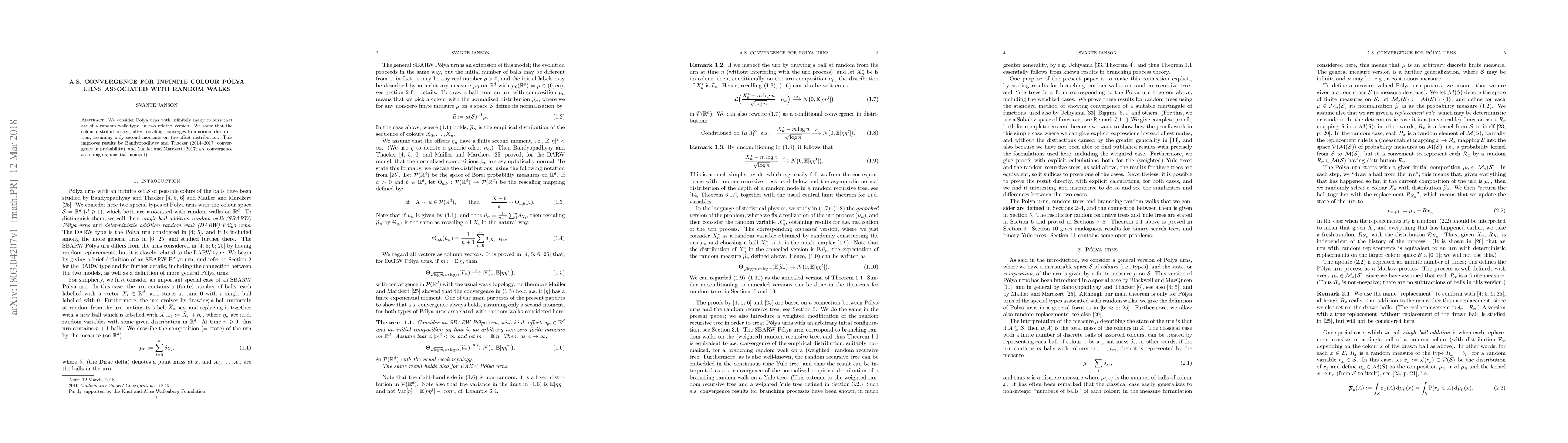 Summary: This paper proves almost sure convergence for infinite colour Pólya urns linked to random walks, showing that the colour distribution converges to a normal distribution after rescaling, under second moment assumptions. This result improves upon previous work requiring either convergence in probability or exponential moment conditions.