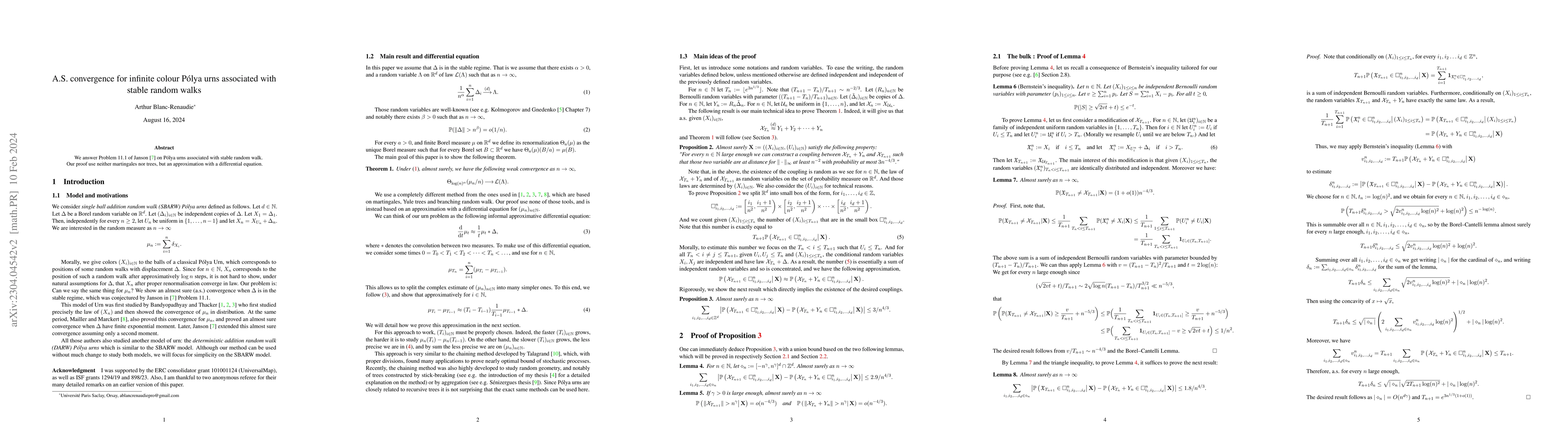 Summary: This paper addresses Problem 11.1 concerning infinite colour Pólya urns linked to stable random walks, proving asymptotic stability without employing martingales or tree methods, instead using a differential equation approximation.