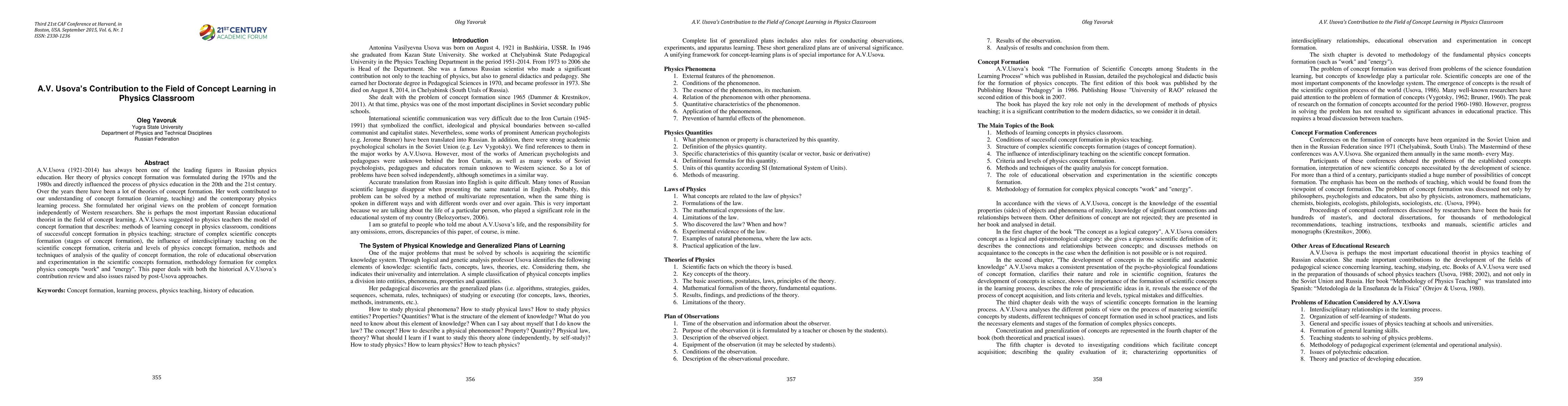 A.V. Usova (1921-2014) has always been one of the leading figures in Russian physics education. Her theory of physics concept formation was formulated during the 1970s and the 1980s and directly influenced the process of physics education in the 20th and the 21st century. Over the years there have been a lot of theories of concept formation. Her work contributed to our understanding of concept formation (learning, teaching) and the contemporary physics learning process. She formulated her original views on the problem of concept formation independently of Western researchers. She is perhaps the most important Russian educational theorist in the field of concept learning. A.V. Usova suggested to physics teachers the model of concept formation that describes: methods of learning concept in physics classroom, conditions of successful concept formation in physics teaching; structure of complex scientific concepts formation (stages of concept formation), the influence of interdisciplinary teaching on the scientific concept formation, criteria and levels of physics concept formation, methods and techniques of analysis of the quality of concept formation, the role of educational observation and experimentation in the scientific concepts formation, methodology formation for complex physics concepts "work" and "energy". This paper deals with both the historical A.V. Usova's contribution review and also issues raised by post-Usova approaches.