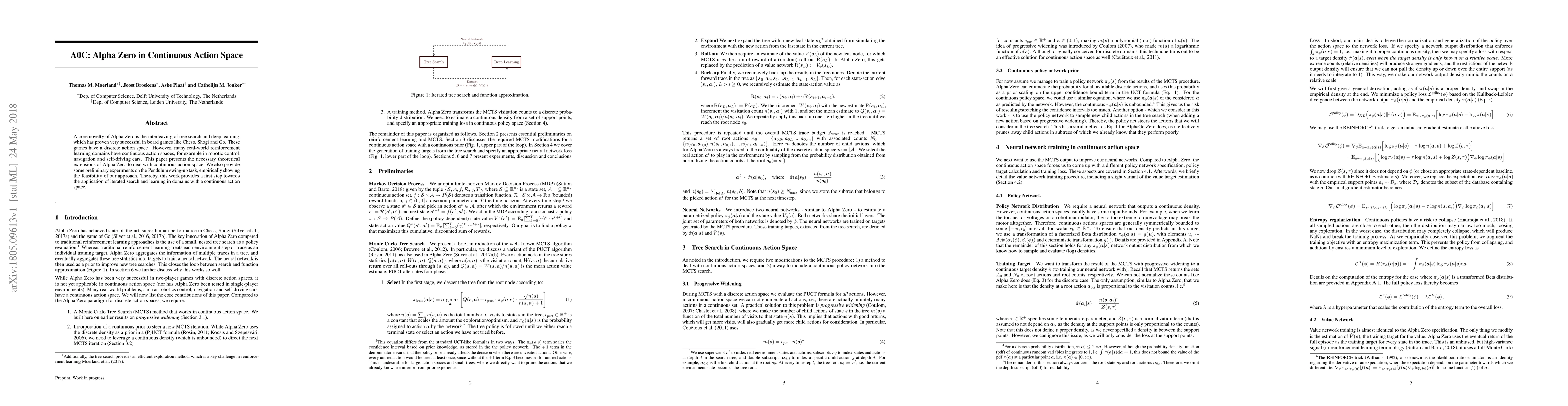 A core novelty of Alpha Zero is the interleaving of tree search and deep learning, which has proven very successful in board games like Chess, Shogi and Go. These games have a discrete action space. However, many real-world reinforcement learning domains have continuous action spaces, for example in robotic control, navigation and self-driving cars. This paper presents the necessary theoretical extensions of Alpha Zero to deal with continuous action space. We also provide some preliminary experiments on the Pendulum swing-up task, empirically showing the feasibility of our approach. Thereby, this work provides a first step towards the application of iterated search and learning in domains with a continuous action space.