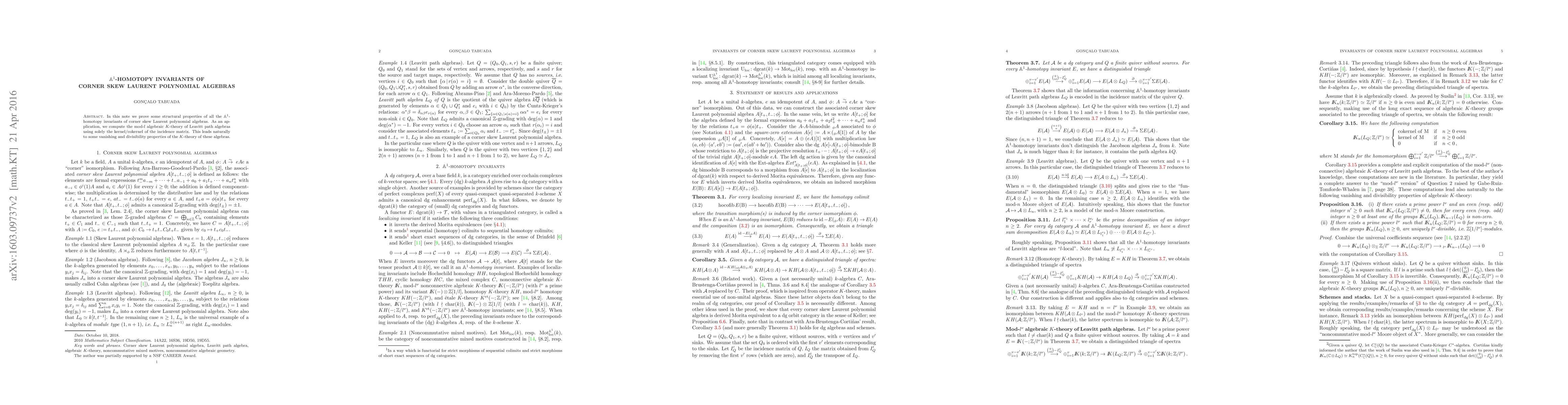 In this note we prove some structural properties of all the A1-homotopy invariants of corner skew Laurent polynomial algebras. As an application, we compute de mod-l algebraic K-theory of Leavitt path algebras using solely the kernel/cokernel of the incidence matrix. This leads naturally to some vanishing and divisibility properties of the algebraic K-theory of these algebras.