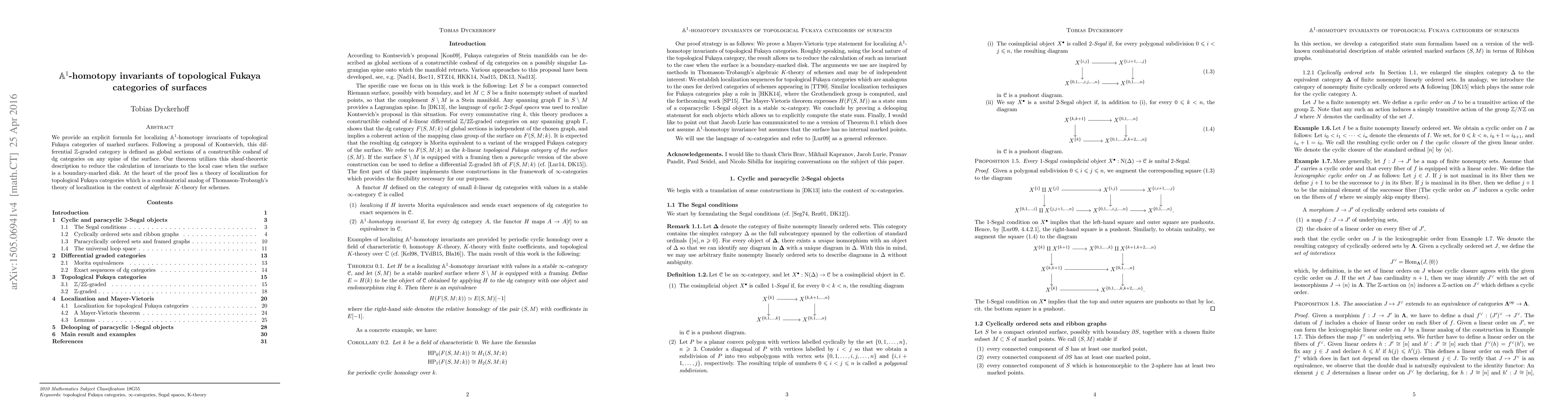 This paper presents an explicit formula for $A^1$-homotopy invariants in topological Fukaya categories of marked surfaces, utilizing a sheaf-theoretic approach that simplifies calculations by reducing them to boundary-marked disks. The proof leverages a combinatorial localization theory analogous to Thomason-Trobaugh's localization in algebraic K-theory.