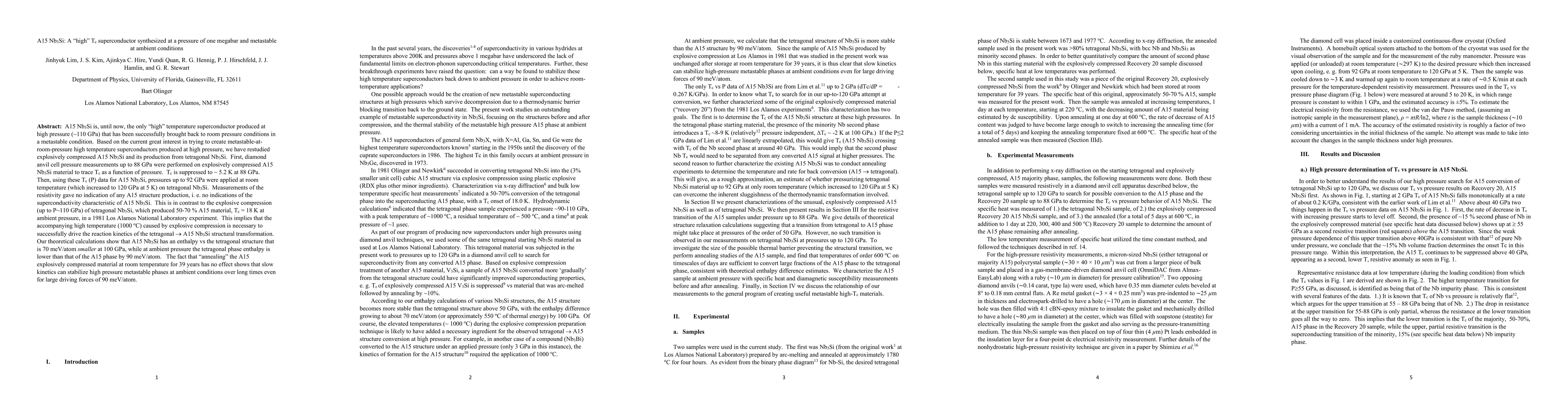 A15 Nb$_3$Si is, until now, the only high temperature superconductor produced at high pressure (~110 GPa) that has been successfully brought back to room pressure conditions in a metastable condition. Based on the current great interest in trying to create metastable-at-room-pressure high temperature superconductors produced at high pressure, we have restudied explosively compressed A15 Nb$_3$Si and its production from tetragonal Nb$_3$Si. First, diamond anvil cell pressure measurements up to 88 GPa were performed on explosively compressed A15 Nb$_3$Si material to trace Tc as a function of pressure. Tc is suppressed to ~ 5.2 K at 88 GPa. Then, using these Tc (P) data for A15 Nb$_3$Si, pressures up to 92 GPa were applied at room temperature (which increased to 120 GPa at 5 K) on tetragonal Nb$_3$Si. Measurements of the resistivity gave no indication of any A15 structure production, i.e., no indications of the superconductivity characteristic of A15 Nb$_3$Si. This is in contrast to the explosive compression (up to P~110 GPa) of tetragonal Nb$_3$Si, which produced 50-70% A15 material, Tc = 18 K at ambient pressure, in a 1981 Los Alamos National Laboratory experiment. Our theoretical calculations show that A15 Nb$_3$Si has an enthalpy vs the tetragonal structure that is 0.07 eV/atom smaller at 100 GPa, implying that the accompanying high temperature (1000 deg C) caused by explosive compression is necessary to successfully drive the reaction kinetics of the tetragonal -> A15 Nb$_3$Si structural transformation. Annealing experiments on the A15 explosively compressed material reaching time scales of 39 years are consistent with this viewpoint.