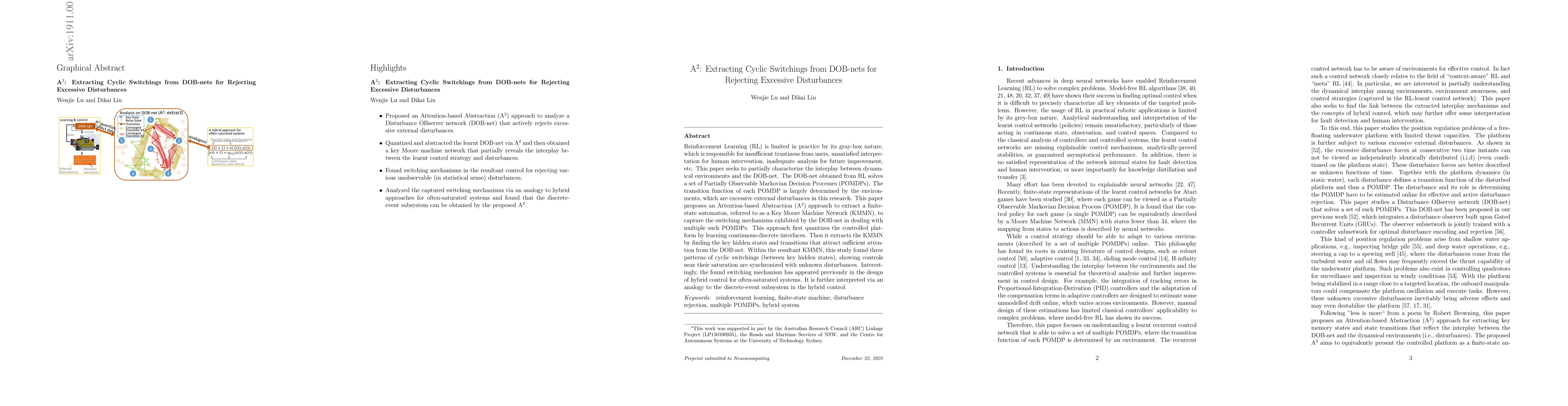 Reinforcement Learning (RL) is limited in practice by its gray-box nature, which is responsible for insufficient trustiness from users, unsatisfied interpretation for human intervention, inadequate analysis for future improvement, etc. This paper seeks to partially characterize the interplay between dynamical environments and the DOB-net. The DOB-net obtained from RL solves a set of Partially Observable Markovian Decision Processes (POMDPs). The transition function of each POMDP is largely determined by the environments, which are excessive external disturbances in this research. This paper proposes an Attention-based Abstraction (A${}^2$) approach to extract a finite-state automaton, referred to as a Key Moore Machine Network (KMMN), to capture the switching mechanisms exhibited by the DOB-net in dealing with multiple such POMDPs. This approach first quantizes the controlled platform by learning continuous-discrete interfaces. Then it extracts the KMMN by finding the key hidden states and transitions that attract sufficient attention from the DOB-net. Within the resultant KMMN, this study found three patterns of cyclic switchings (between key hidden states), showing controls near their saturation are synchronized with unknown disturbances. Interestingly, the found switching mechanism has appeared previously in the design of hybrid control for often-saturated systems. It is further interpreted via an analogy to the discrete-event subsystem in the hybrid control.