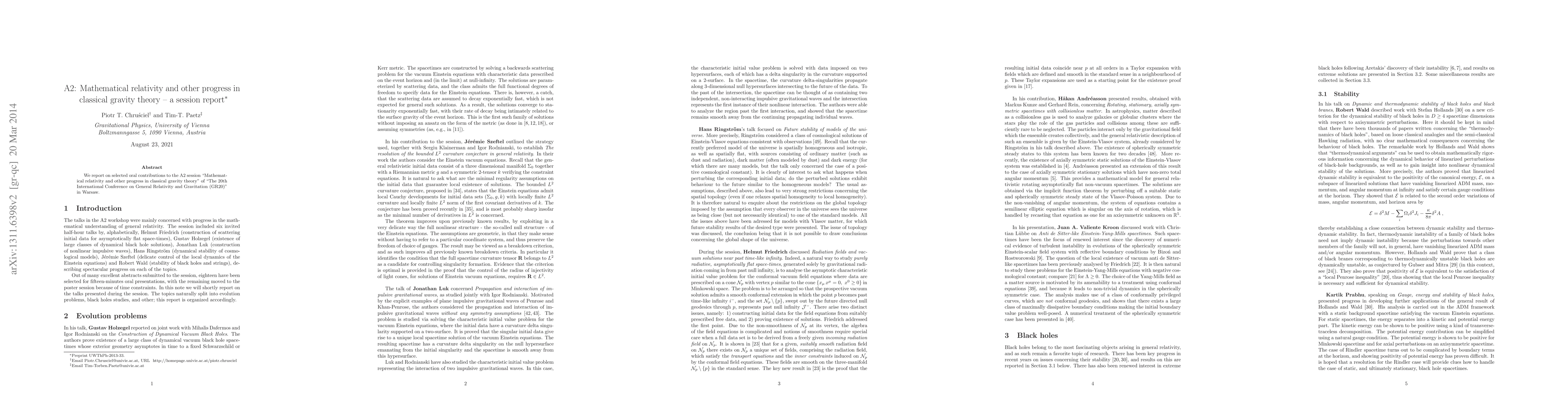 We report on selected oral contributions to the A2 session "Mathematical relativity and other progress in classical gravity theory" of "The 20th International Conference on General Relativity and Gravitation (GR20)" in Warsaw.