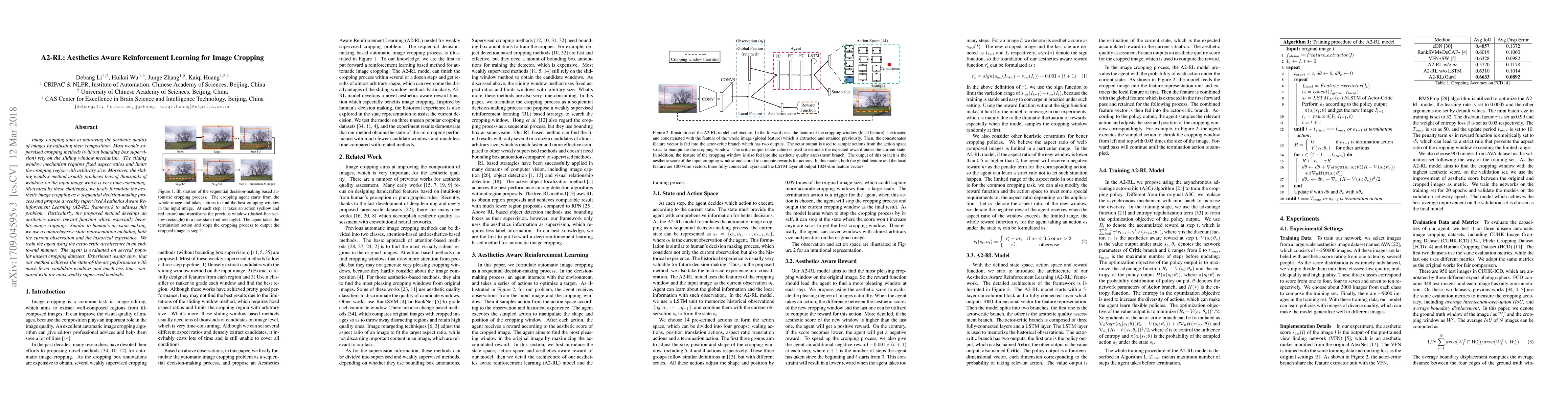 This paper proposes A2-RL, a weakly supervised Reinforcement Learning framework for aesthetic image cropping, which formulates cropping as a sequential decision-making process. The method achieves state-of-the-art performance with fewer candidate windows and less time compared to traditional sliding window methods.