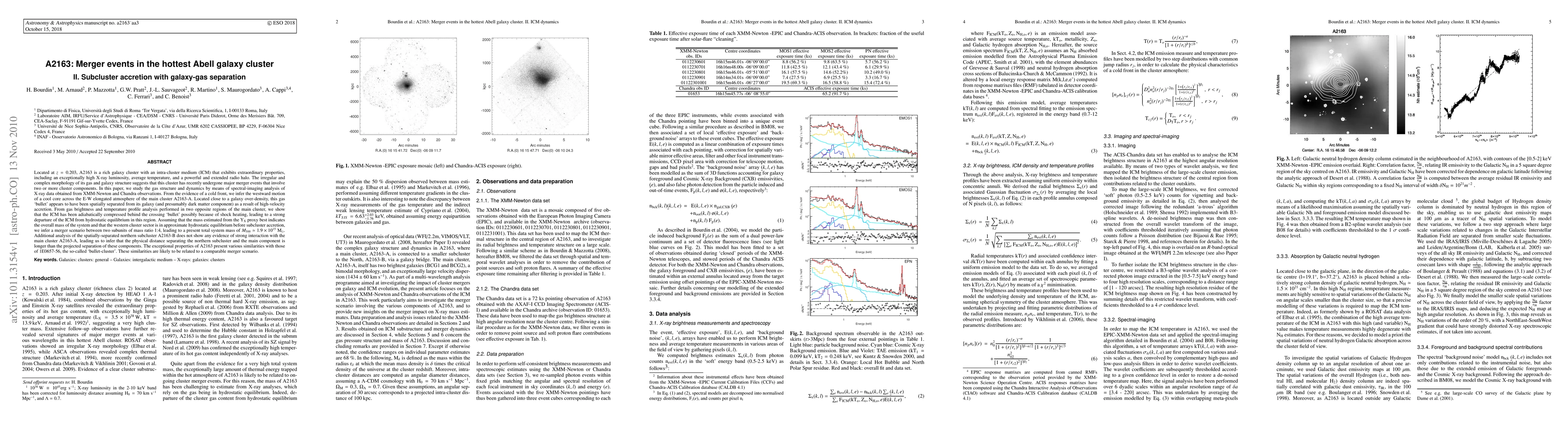 The research on A2163, a z = 0.203 rich galaxy cluster, reveals a recent major merger event through analysis of X-ray data from XMM-Newton and Chandra. A cool gas 'bullet' separated from its galaxy counterpart during high-velocity accretion, causing ICM compression and departure from hydrostatic equilibrium. The study infers a merger of two subunits with a 1:4 mass ratio, estimating the total system mass at ~1.9 x 10^15 M☉, drawing parallels to the 'bullet-cluster' 1E0657-56.