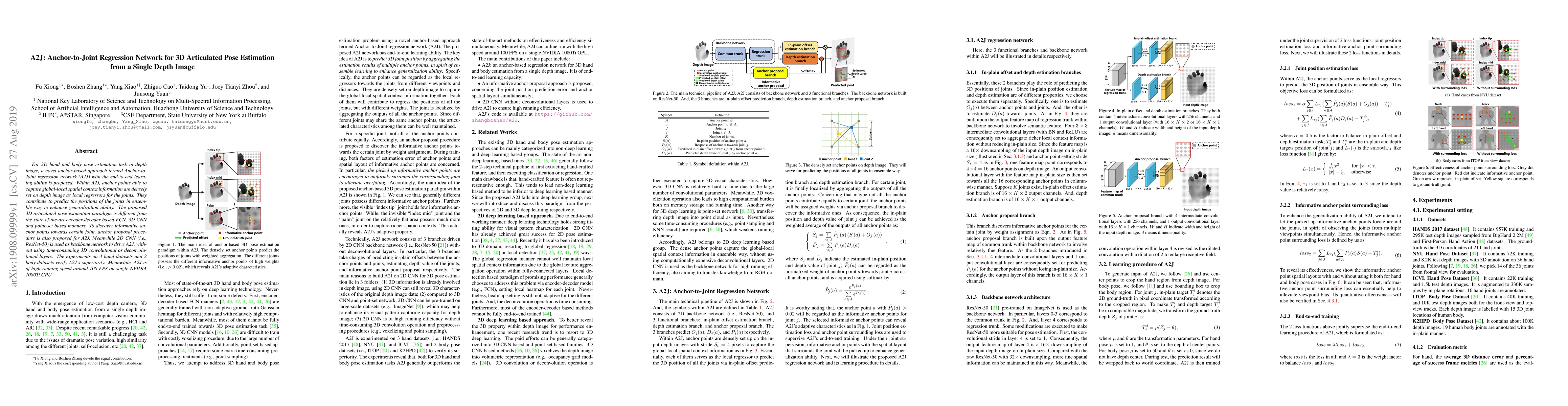 The paper proposes a novel Anchor-to-Joint regression network (A2J) for 3D articulated pose estimation from a single depth image, utilizing anchor points to capture spatial context and predict joint positions. A2J leverages 2D CNN as a backbone, achieving high speed and accuracy on multiple datasets.