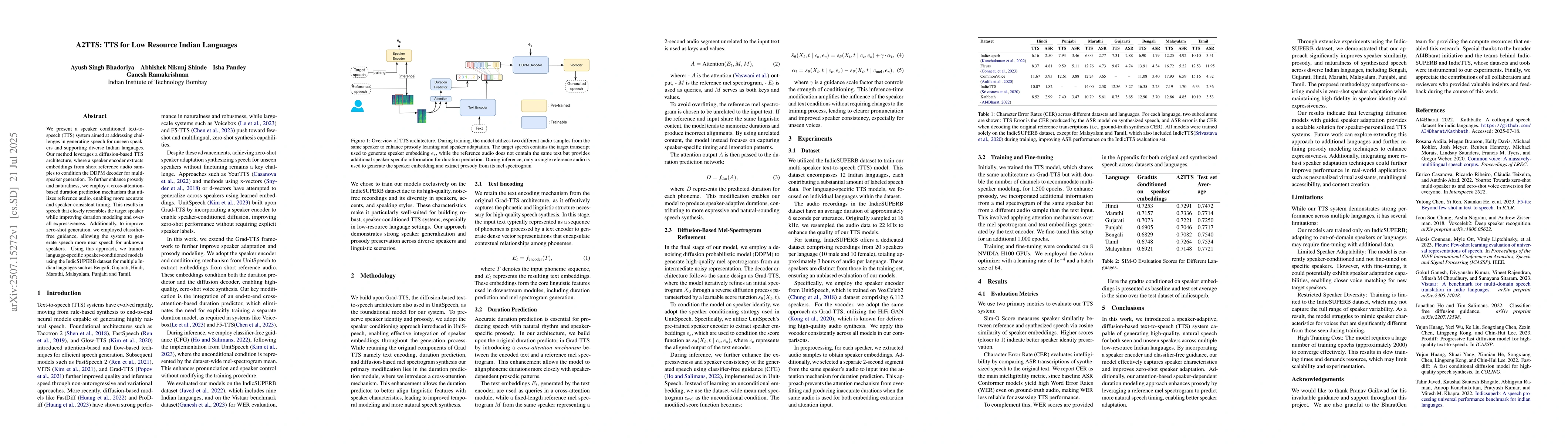 We present a speaker conditioned text-to-speech (TTS) system aimed at addressing challenges in generating speech for unseen speakers and supporting diverse Indian languages. Our method leverages a diffusion-based TTS architecture, where a speaker encoder extracts embeddings from short reference audio samples to condition the DDPM decoder for multispeaker generation. To further enhance prosody and naturalness, we employ a cross-attention based duration prediction mechanism that utilizes reference audio, enabling more accurate and speaker consistent timing. This results in speech that closely resembles the target speaker while improving duration modeling and overall expressiveness. Additionally, to improve zero-shot generation, we employed classifier free guidance, allowing the system to generate speech more near speech for unknown speakers. Using this approach, we trained language-specific speaker-conditioned models. Using the IndicSUPERB dataset for multiple Indian languages such as Bengali, Gujarati, Hindi, Marathi, Malayalam, Punjabi and Tamil.