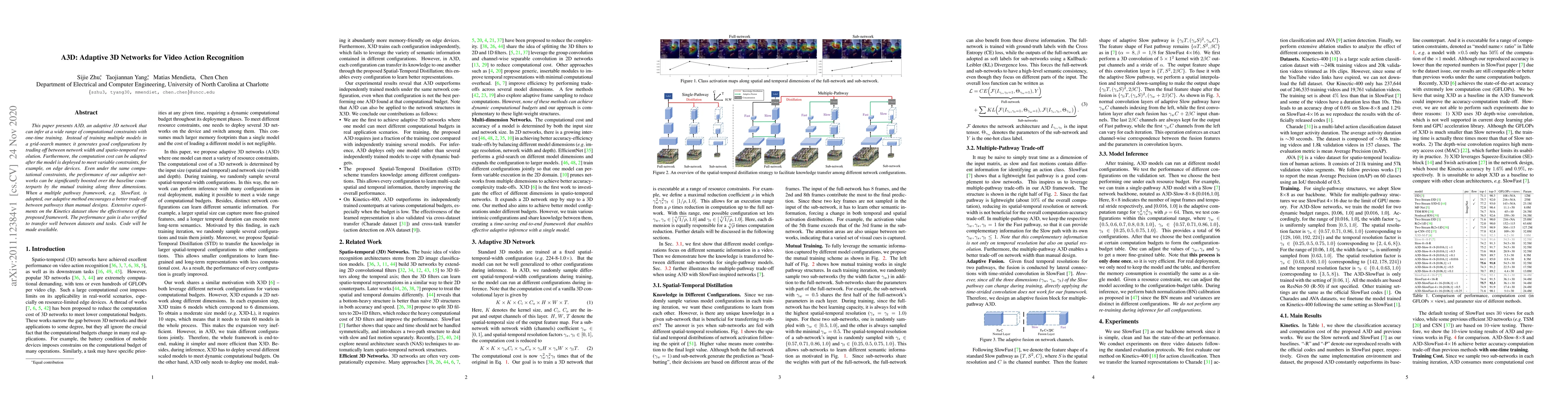 This paper introduces A3D, an adaptive 3D network for video action recognition that optimizes performance under varying computational constraints through one-time training, achieving better results than baseline models by leveraging mutual training across dimensions. The method also allows for runtime adaptation of computational costs, demonstrating effectiveness on the Kinetics dataset.