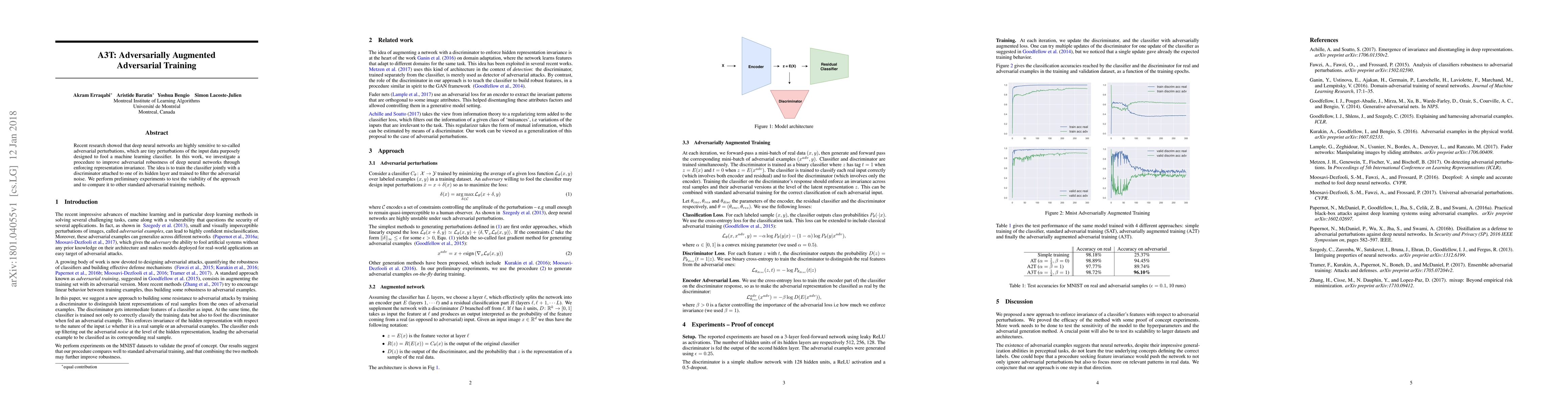 Recent research showed that deep neural networks are highly sensitive to so-called adversarial perturbations, which are tiny perturbations of the input data purposely designed to fool a machine learning classifier. Most classification models, including deep learning models, are highly vulnerable to adversarial attacks. In this work, we investigate a procedure to improve adversarial robustness of deep neural networks through enforcing representation invariance. The idea is to train the classifier jointly with a discriminator attached to one of its hidden layer and trained to filter the adversarial noise. We perform preliminary experiments to test the viability of the approach and to compare it to other standard adversarial training methods.