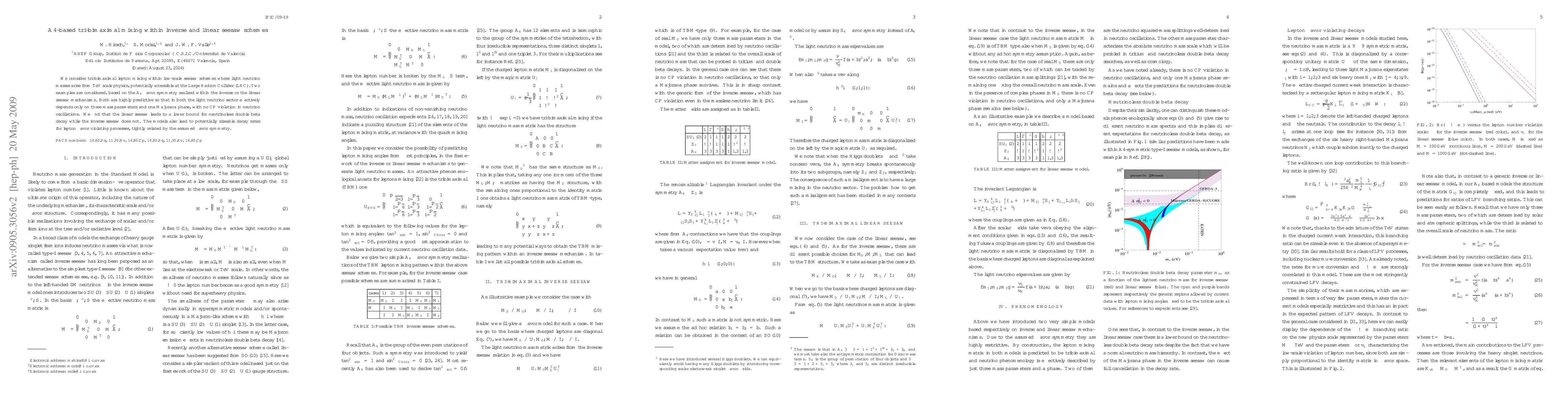 This paper explores tri-bimaximal neutrino mixing within inverse and linear seesaw frameworks based on A4 flavor symmetry, predicting low-scale neutrino masses and minimal CP violation. The linear seesaw imposes a lower bound on neutrinoless double beta decay, while the inverse seesaw does not, and both predict significant lepton flavor violation rates.