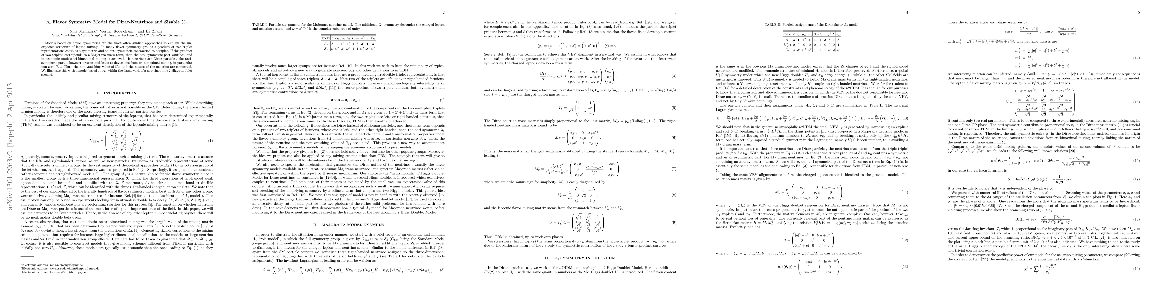 Models based on flavor symmetries are the most often studied approaches to explain the unexpected structure of lepton mixing. In many flavor symmetry groups a product of two triplet representations contains a symmetric and an anti-symmetric term. If this product of two triplets corresponds to a Majorana mass term, then the anti-symmetric part vanishes, and in economic models tri-bimaximal mixing is achieved. If neutrinos are Dirac particles, the anti-symmetric part is however present and leads to deviations from tri-bimaximal mixing, in particular non-zero U(e3). Thus, the non-vanishing value of U(e3) and the nature of the neutrino are connected. We illustrate this with a model based on A(4) within the framework of a neutrinophilic 2 Higgs doublet scenario.
