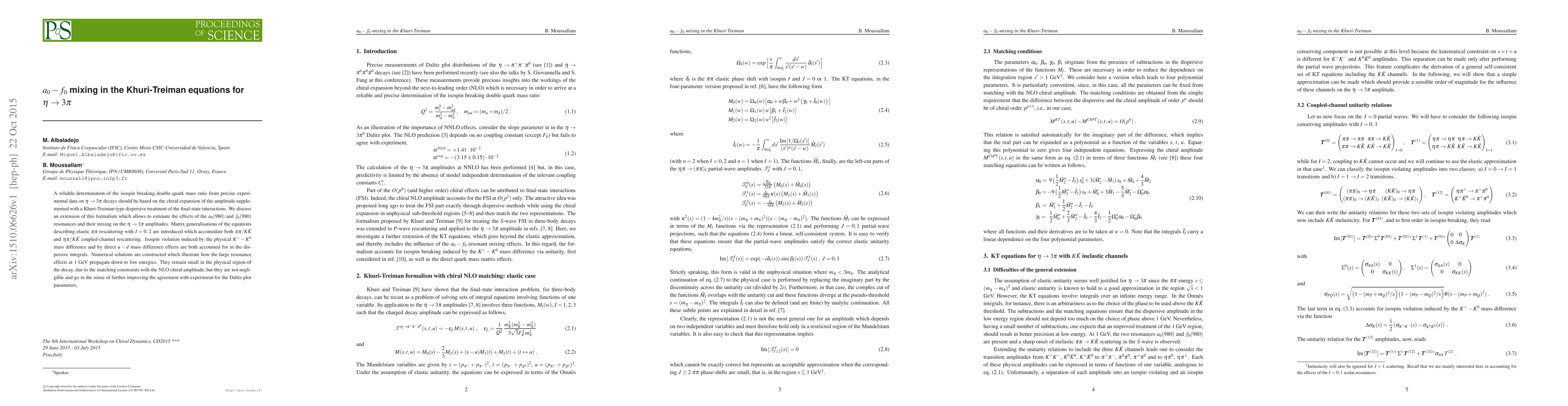 A reliable determination of the isospin breaking double quark mass ratio from precise experimental data on $\eta\to 3\pi$ decays should be based on the chiral expansion of the amplitude supplemented with a Khuri-Treiman type dispersive treatment of the final-state interactions. We discuss an extension of this formalism which allows to estimate the effects of the $a_0(980)$ and $f_0(980)$ resonances and their mixing on the $\eta\to 3\pi$ amplitudes. Matrix generalisations of the equations describing elastic $\pi\pi$ rescattering with $I=0,\,2$ are introduced which accomodate both $\pi\pi/K\bar{K}$ and $\eta\pi/K\bar{K}$ coupled-channel rescattering. Isospin violation induced by the physical $K^+-K^0$ mass difference and by direct $u-d$ mass difference effects are both accounted for in the dispersive integrals. Numerical solutions are constructed which illustrate how the large resonance effects at 1 GeV propagate down to low energies. They remain small in the physical region of the decay, due to the matching constraints with the NLO chiral amplitude, but they are not negligible and go in the sense of further improving the agreement with experiment for the Dalitz plot parameters.