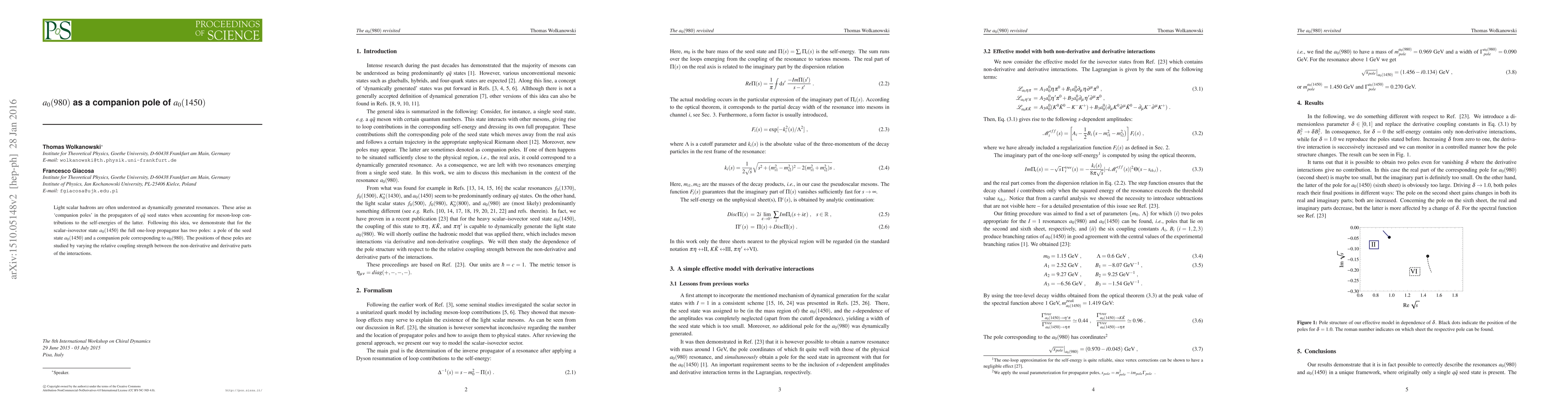The paper explores light scalar hadrons as dynamically generated resonances, specifically focusing on the scalar-isovector state $a_0(1450)$. It demonstrates that the full one-loop propagator of $a_0(1450)$ has two poles: $a_0(1450)$ itself and a companion pole corresponding to $a_0(980)$. The study varies the relative coupling strength between non-derivative and derivative interaction parts to examine these pole positions.