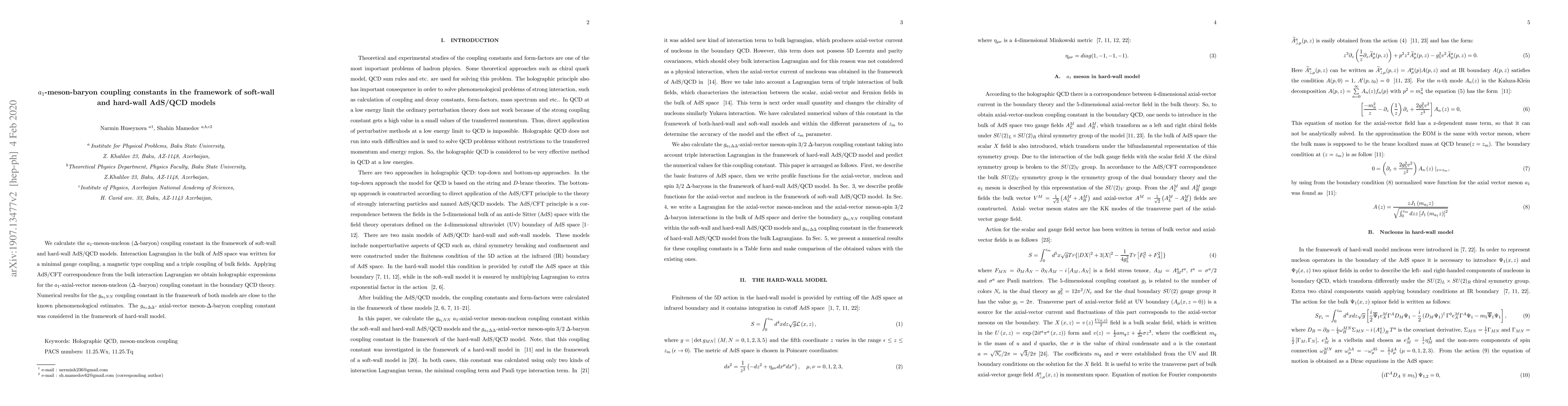 This paper calculates the $a_1$ meson-nucleon and $a_1$ meson-$\Delta$-baryon coupling constants using soft-wall and hard-wall AdS/QCD models, finding values closer to experimental data than previous studies. The calculations utilize bulk interaction Lagrangians and the AdS/CFT correspondence.