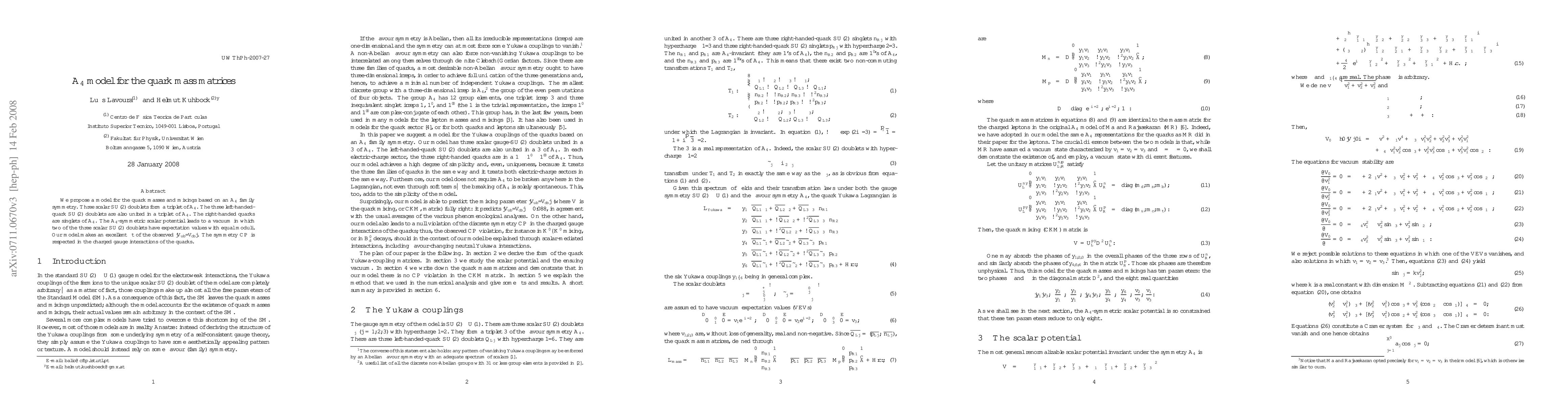 We propose a model for the quark masses and mixings based on an A_4 family symmetry. Three scalar SU(2) doublets form a triplet of A_4. The three left-handed-quark SU(2) doublets are also united in a triplet of A_4. The right-handed quarks are singlets of A_4. The A_4-symmetric scalar potential leads to a vacuum in which two of the three scalar SU(2) doublets have expectation values with equal moduli. Our model makes an excellent fit of the observed |V_ub/V_cb|. The symmetry CP is respected in the charged gauge interactions of the quarks.