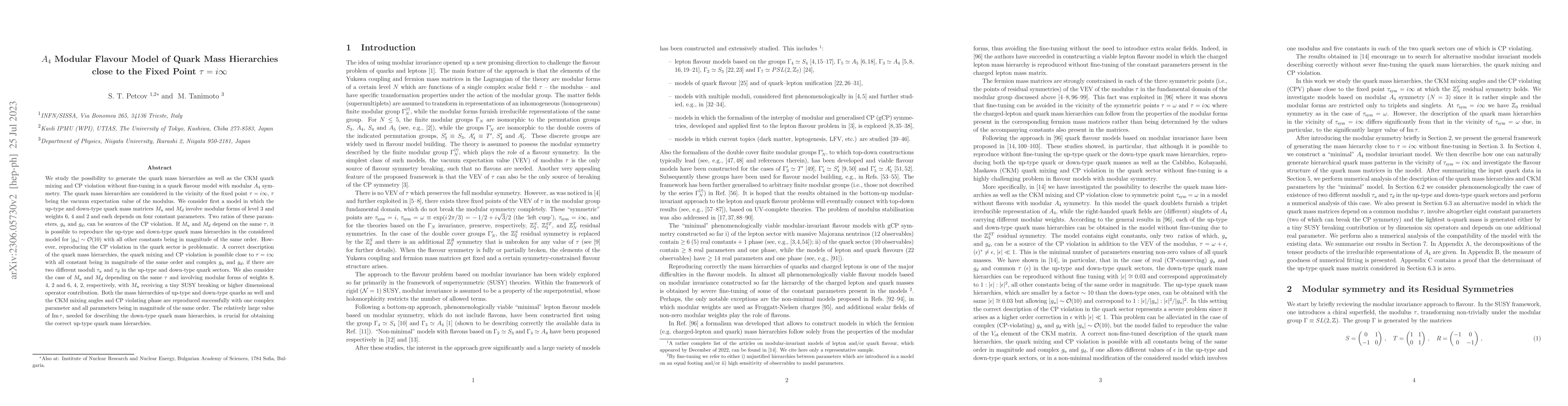 This paper explores a modular $A_4$ symmetry model to naturally generate the quark mass hierarchies, CKM mixing, and CP violation without fine-tuning, focusing on the fixed point $\tau = i\infty$. The model successfully reproduces observed quark masses and mixing angles using a small number of parameters.