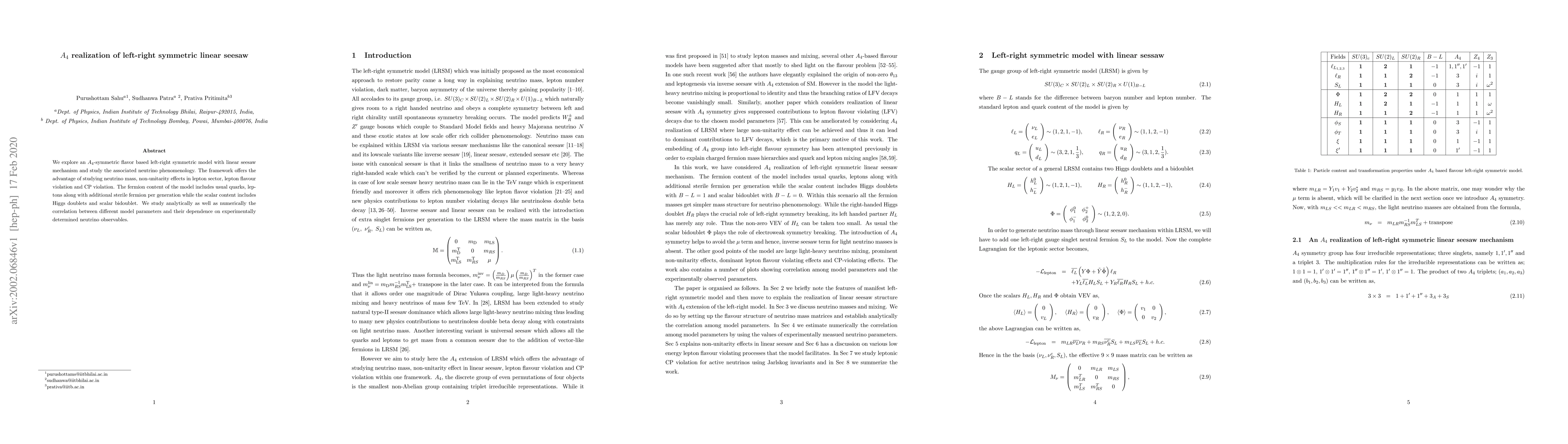 This paper investigates a left-right symmetric model based on $A_4$ symmetry with a linear seesaw mechanism, exploring neutrino mass generation, non-unitarity effects, and CP violation. The model includes standard quarks, leptons, and additional sterile fermions, alongside Higgs doublets and a scalar bidoublet, with a focus on parameter correlations and their implications for experimental observations.