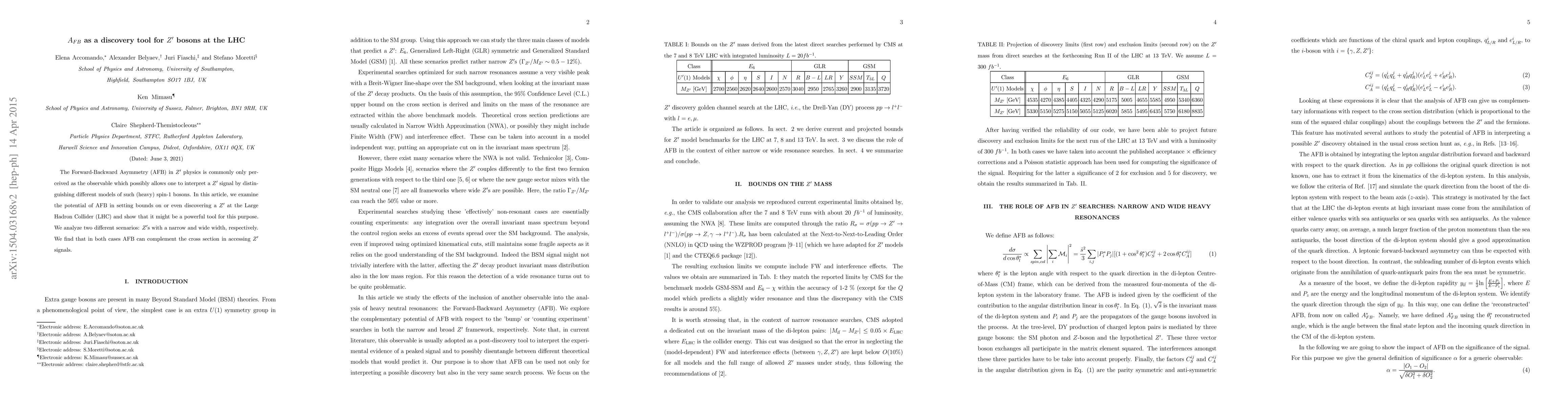 The Forward-Backward Asymmetry (AFB) in $Z^\prime$ physics is commonly only perceived as the observable which possibly allows one to interpret a $Z^\prime$ signal by distinguishing different models of such (heavy) spin-1 bosons. In this article, we examine the potential of AFB in setting bounds on or even discovering a $Z^\prime$ at the Large Hadron Collider (LHC) and show that it might be a powerful tool for this purpose. We analyze two different scenarios: $Z^\prime$s with a narrow and wide width, respectively. We find that in both cases AFB can complement the cross section in accessing $Z^\prime$ signals.