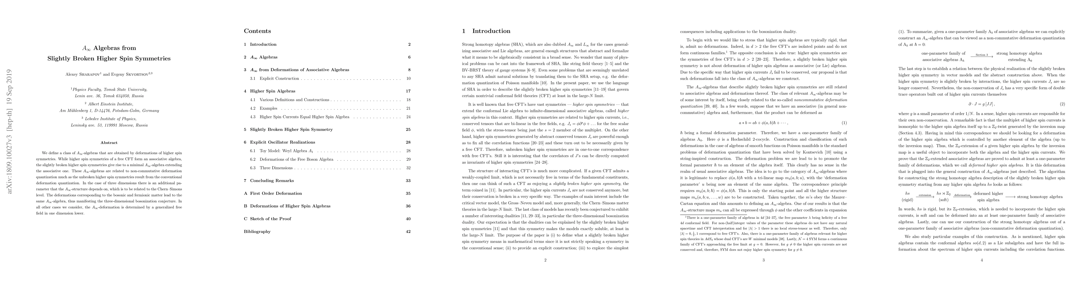 This paper defines $A_\infty$-algebras derived from slightly broken higher spin symmetries in conformal field theories (CFTs), showing they extend associative algebras found in unbroken symmetries. In three dimensions, the $A_\infty$-structure correlates with the Chern-Simons level, and bosonic and fermionic matter deformations yield the same $A_\infty$-algebra, supporting the bosonization conjecture.
