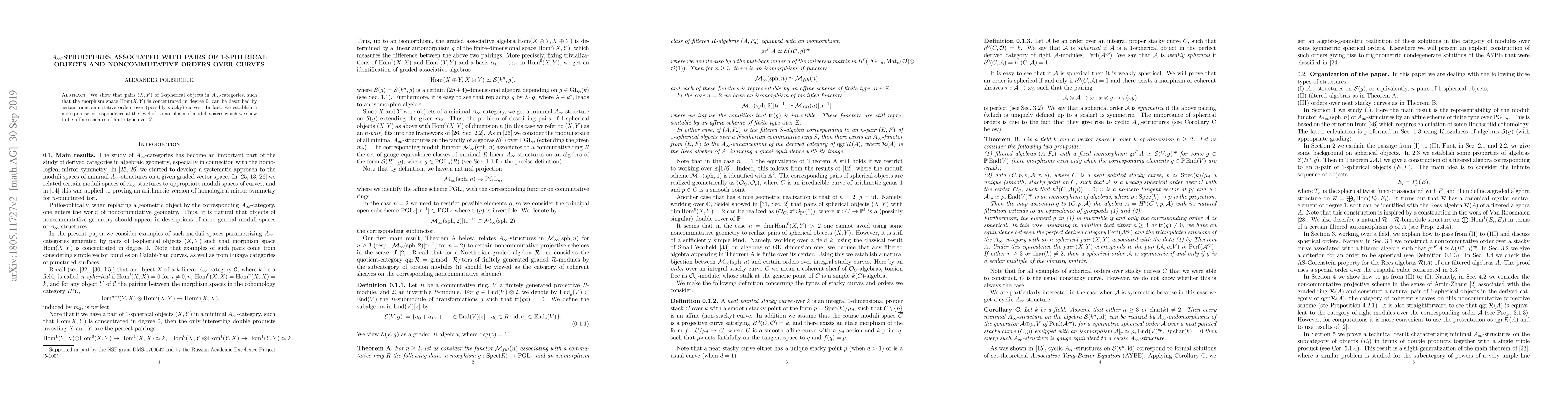 We show that pairs $(X,Y)$ of 1-spherical objects in $A_\infty$-categories, such that the morphism space ${\rm Hom}(X,Y)$ is concentrated in degree 0, can be described by certain noncommutative orders over (possibly stacky) curves. In fact, we establish a more precise correspondence at the level of isomorphism of moduli spaces which we show to be affine schemes of finite type over ${\Bbb Z}$.
