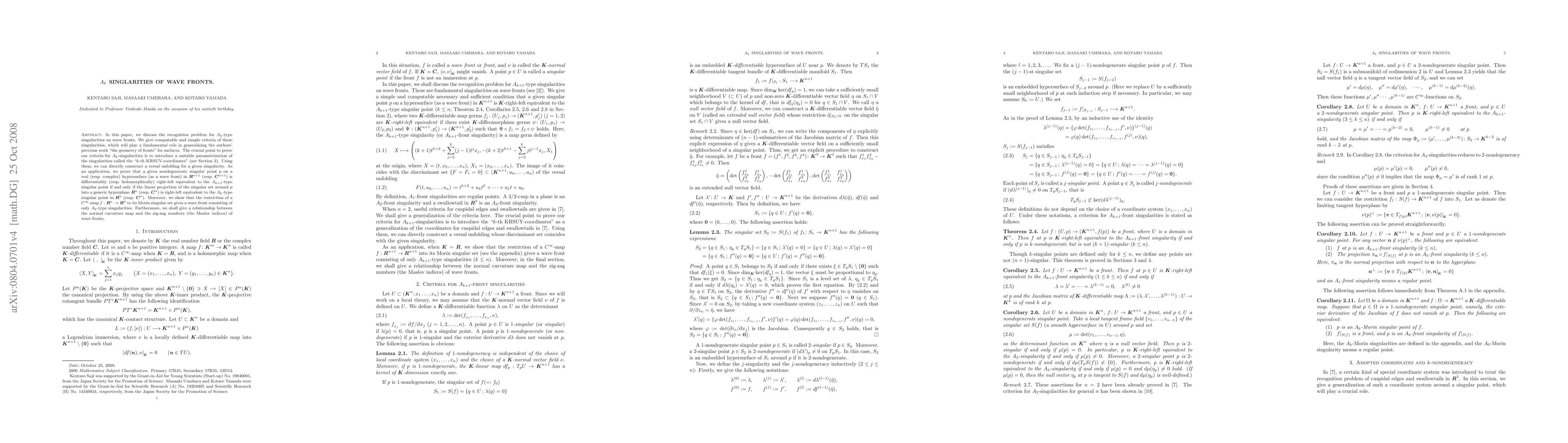 This paper presents criteria for recognizing A_k-type singularities on wave fronts using a new parametrization called "k-th KRSUY-coordinates." It establishes a versal unfolding for these singularities and proves their equivalence under linear projection, extending the authors' prior work on the geometry of fronts.