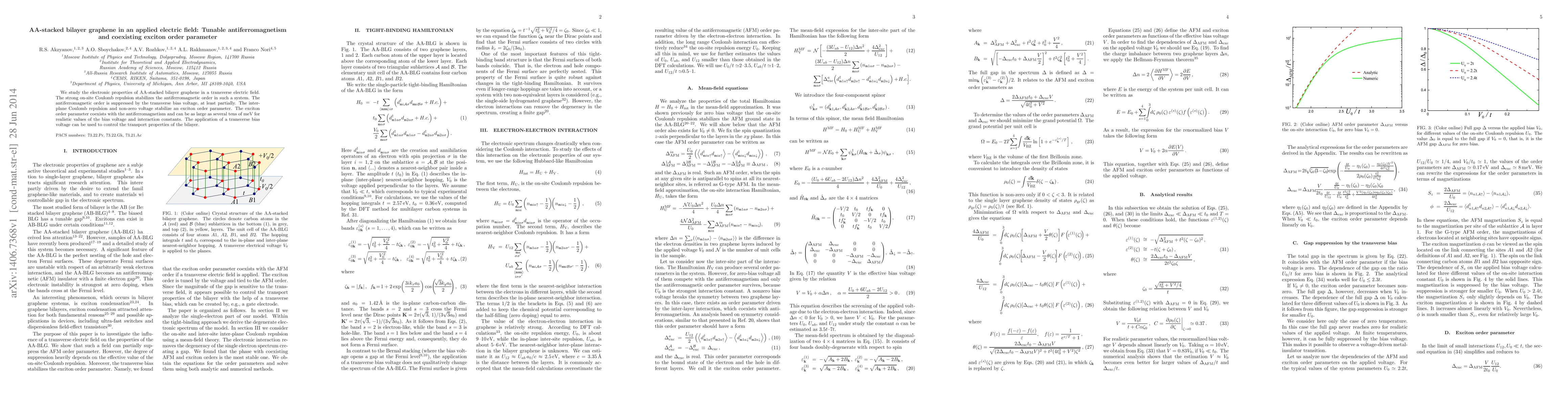 We study the electronic properties of AA-stacked bilayer graphene in a transverse electric field. The strong on-site Coulomb repulsion stabilizes the antiferromagnetic order in such a system. The antiferromagnetic order is suppressed by the transverse bias voltage, at least partially. The inter-plane Coulomb repulsion and non-zero voltage stabilize an exciton order parameter. The exciton order parameter coexists with the antiferromagnetism and can be as large as several tens of meV for realistic values of the bias voltage and interaction constants. The application of a transverse bias voltage can be used to control the transport properties of the bilayer.
