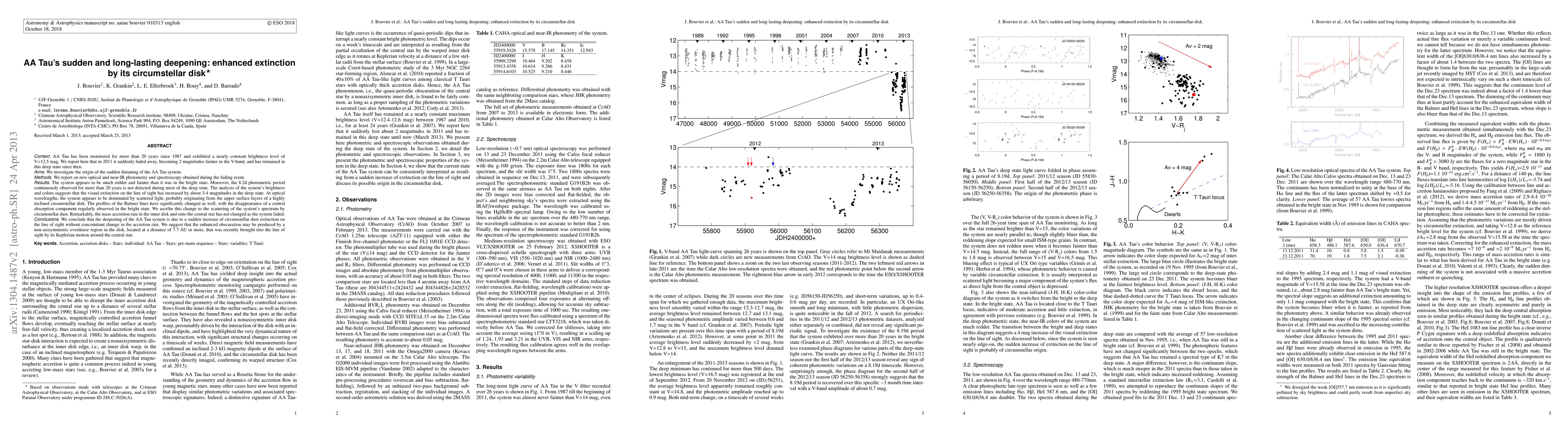 AA Tau has been monitored for more than 20 years since 1987, exhibiting a nearly constant brightness level of V=12.5 mag. We report here that in 2011 it suddenly faded away, becoming 2 magnitudes fainter in the V-band, and has remained in this deep state since then. We report new optical and near-IR photometry and spectroscopy obtained during the fading event. The system appears much redder and fainter than it was in the bright state. Also, the 8.2d photometric period continuously observed for more than 20 years is not seen during most of the deep state. The analysis of the system's brightness and colors suggests that the visual extinction on the line of sight has increased by about 3-4 magnitudes in the deep state. At optical wavelengths, the system appears to be dominated by scattered light, probably originating from the upper surface layers of a highly inclined circumstellar disk. The profiles of the Balmer lines have significantly changed as well, with the disappearance of a central absorption component regularly observed in the bright state. We ascribe this change to the scattering of the system's spectrum by circumstellar dust. Noticeably, the mass accretion rate in the inner disk and onto the central star has not changed as the system faded away. We conclude that the deepening of the AA Tau system is due to a sudden increase of circumstellar dust extinction on the line of sight without concomitant change in the accretion rate. We suggest that the enhanced obscuration may be produced by a non-axisymmetric overdense region in the disk, located at a distance of 7.7 AU or more, that was recently brought on the line of sight by its keplerian motion around the central star.