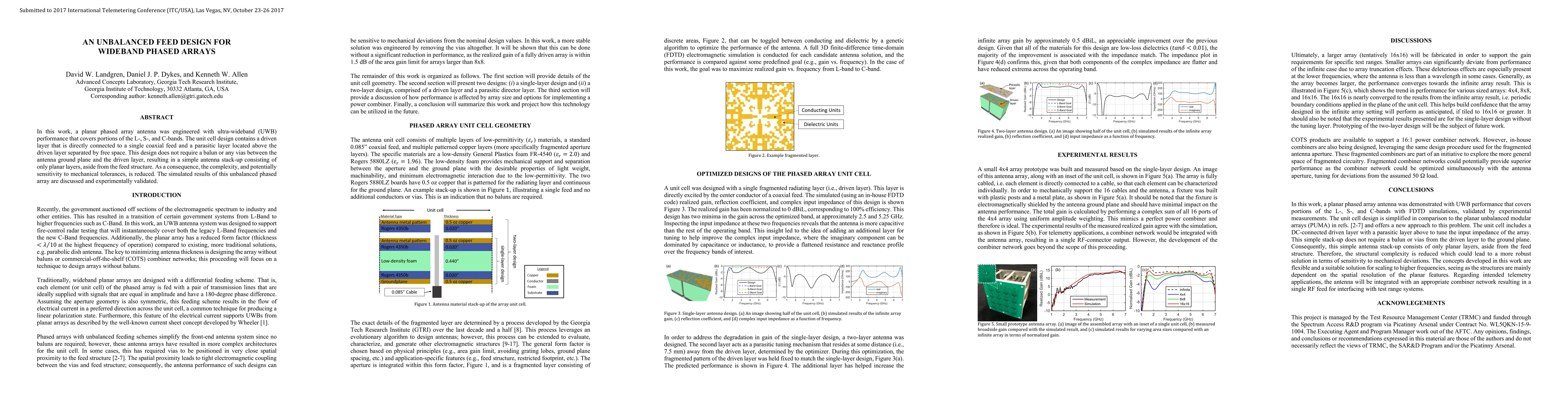 In this work, a planar phased array antenna was engineered with ultra-wideband (UWB) performance that covers portions of the L-, S-, and C-bands. The unit cell design contains a driven layer that is directly connected to a single coaxial feed and a parasitic layer located above the driven layer separated by free space. This design does not require a balun or any vias between the antenna ground plane and the driven layer, resulting in a simple antenna stack-up consisting of only planar layers, aside from the feed structure. As a consequence, the complexity, and potentially sensitivity to mechanical tolerances, is reduced. The simulated results of this unbalanced phased array are discussed and experimentally validated.