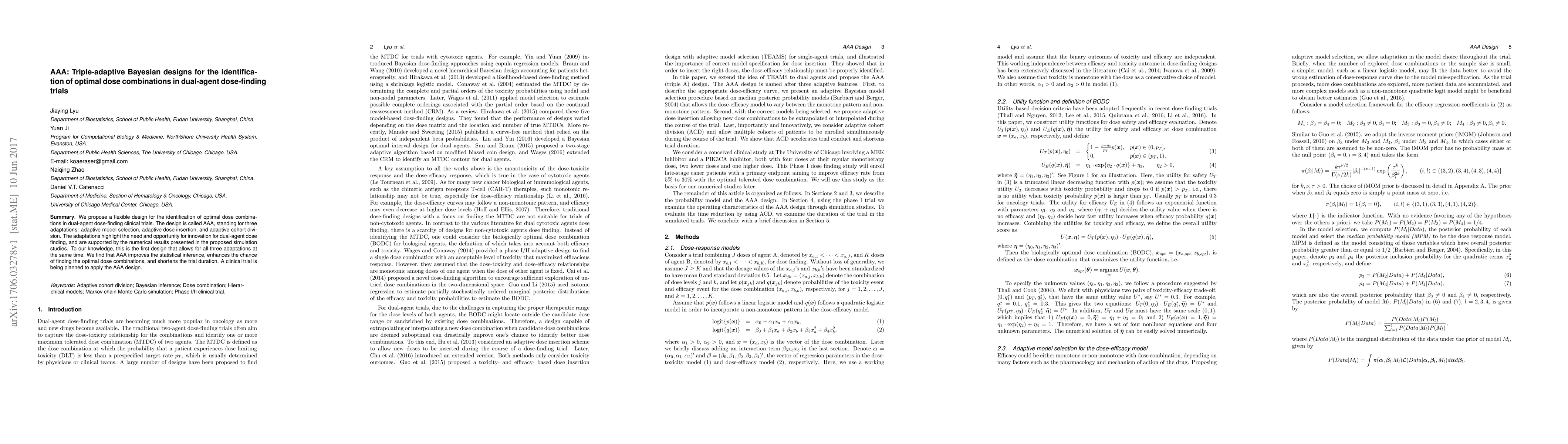 The AAA design introduces adaptive model selection, adaptive dose insertion, and adaptive cohort division for dual-agent dose-finding trials, significantly improving statistical inference, increasing the likelihood of identifying optimal dose combinations, and reducing trial duration. This innovative approach is supported by simulation studies and a planned clinical trial.