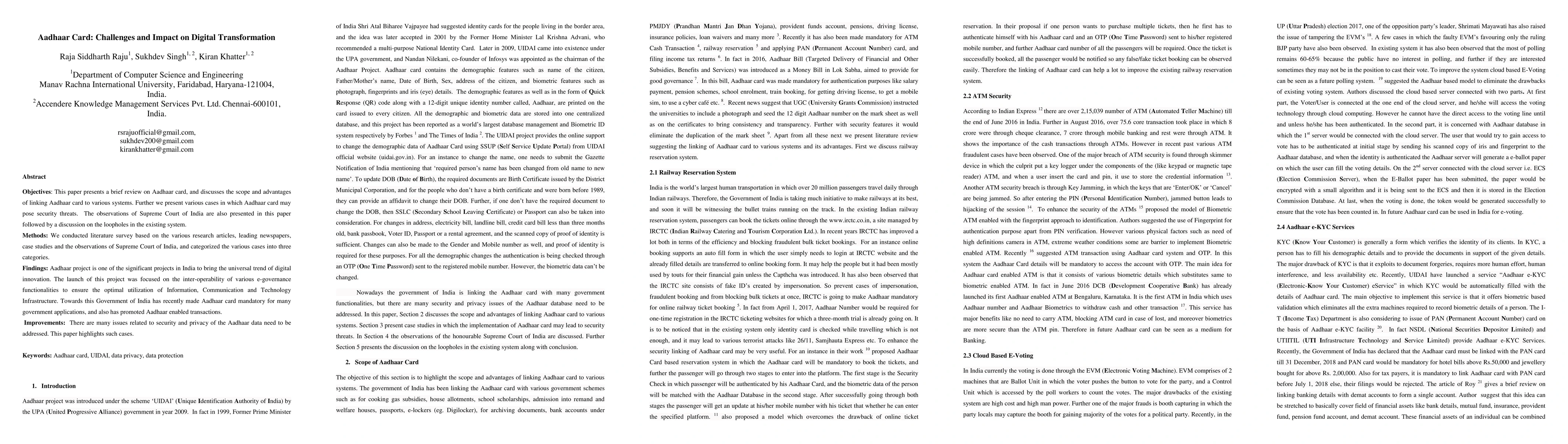 Objectives: This paper presents a brief review on Aadhaar card, and discusses the scope and advantages of linking Aadhaar card to various systems. Further we present various cases in which Aadhaar card may pose security threats. The observations of Supreme Court of India are also presented in this paper followed by a discussion on the loopholes in the existing system. Methods: We conducted literature survey based on the various research articles, leading newspapers, case studies and the observations of Supreme Court of India, and categorized the various cases into three categories. Findings: Aadhaar project is one of the significant projects in India to bring the universal trend of digital innovation. The launch of this project was focused on the inter-operability of various e-governance functionalities to ensure the optimal utilization of Information, Communication and Technology Infrastructure. Towards this Government of India has recently made Aadhaar card mandatory for many government applications, and also has promoted Aadhaar enabled transactions. Improvements: There are many issues related to security and privacy of the Aadhaar data need to be addressed. This paper highlights such cases.