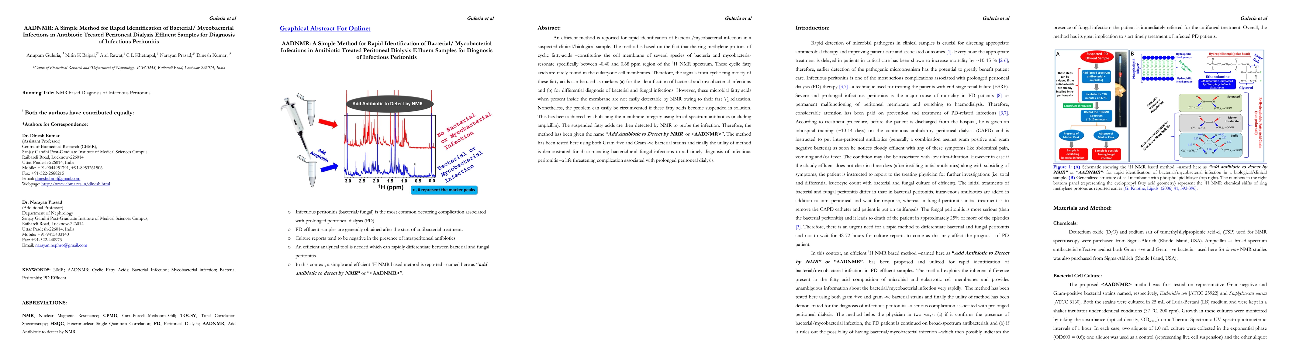 An efficient method is reported for rapid identification of bacterial or mycobacterial infection in a suspected clinical/biological sample. The method is based on the fact that the ring methylene protons of cyclic fatty acids (constituting the cell membrane of several species of bacteria and mycobacteria) resonate specifically between -0.40 and 0.68 ppm region of the 1H NMR spectrum. These cyclic fatty acids are rarely found in the eukaryotic cell membranes. Therefore, the signals from cyclic ring moiety of these fatty acids can be used as markers (a) for the identification of bacterial and mycobacterial infections and (b) for differential diagnosis of bacterial and fungal infections. However, these microbial fatty acids when present inside the membrane are not easily detectable by NMR owing to their fast T2 relaxation. Nonetheless, the problem can easily be circumvented if these fatty acids become suspended in solution. This has been achieved by abolishing the membrane integrity using broad spectrum antibiotics (including ampicillin). The suspended fatty acids are then detected by NMR to probe the infection. Therefore, the method has been given the name AADNMR i.e. Add Antibiotic to Detect by NMR. The method has been tested here using both Gram positive and Gram negative bacterial strains and finally the utility of method is demonstrated for discriminating bacterial and fungal infections to aid timely diagnosis of infectious peritonitis (a life threatening complication associated with prolonged peritoneal dialysis).