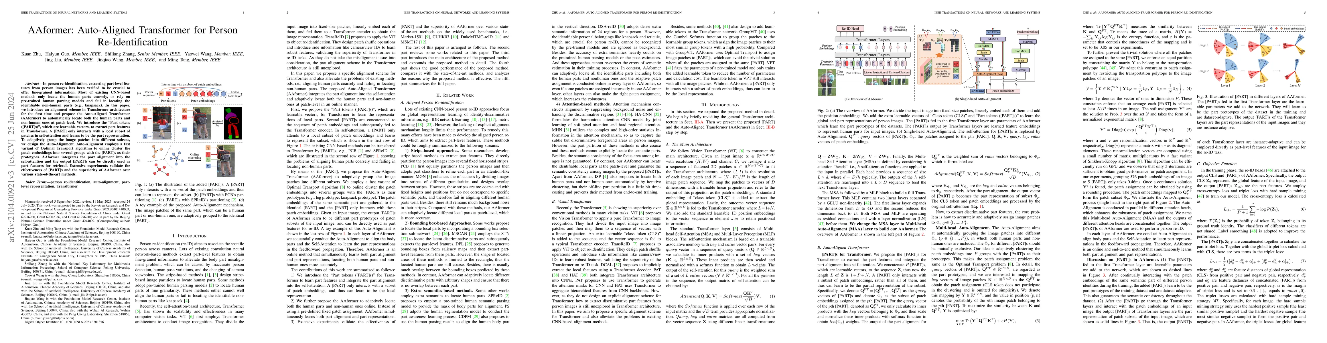 AAformer introduces an auto-aligned transformer that automatically locates both human and nonhuman parts at the patch level for person re-identification. It uses "Part tokens" in the transformer to extract fine-grained part features, achieving superior performance over existing CNN-based methods.