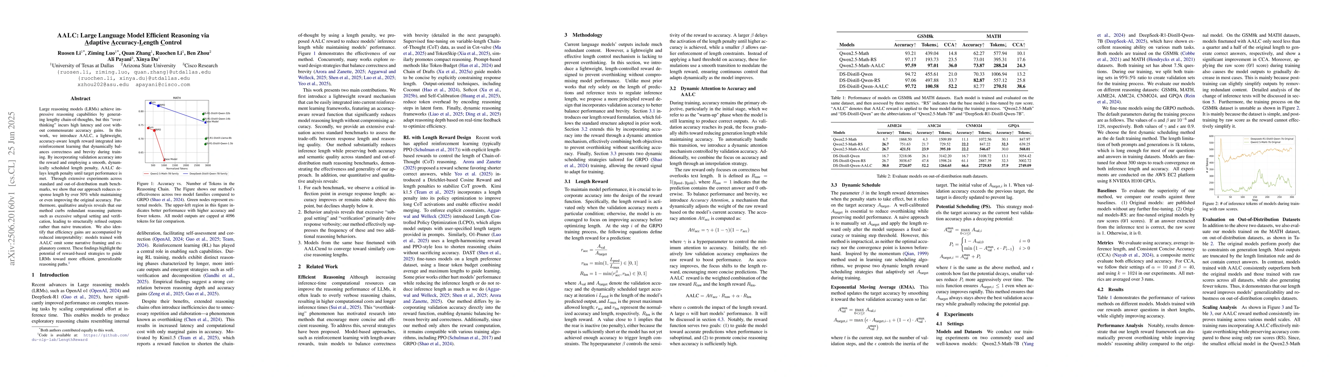Large reasoning models (LRMs) achieve impressive reasoning capabilities by generating lengthy chain-of-thoughts, but this "overthinking" incurs high latency and cost without commensurate accuracy gains. In this work, we introduce AALC, a lightweight, accuracy-aware length reward integrated into reinforcement learning that dynamically balances correctness and brevity during training. By incorporating validation accuracy into the reward and employing a smooth, dynamically scheduled length penalty, AALC delays length penalty until target performance is met. Through extensive experiments across standard and out-of-distribution math benchmarks, we show that our approach reduces response length by over 50% while maintaining or even improving the original accuracy. Furthermore, qualitative analysis reveals that our method curbs redundant reasoning patterns such as excessive subgoal setting and verification, leading to structurally refined outputs rather than naive truncation. We also identify that efficiency gains are accompanied by reduced interpretability: models trained with AALC omit some narrative framing and explanatory context. These findings highlight the potential of reward-based strategies to guide LRMs toward more efficient, generalizable reasoning paths.