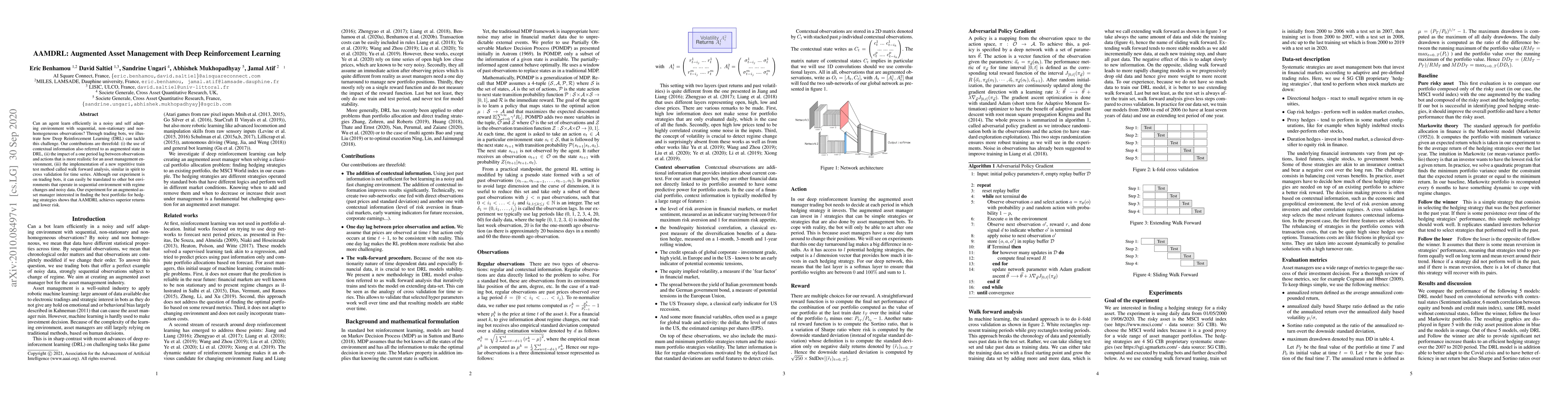 Can an agent learn efficiently in a noisy and self adapting environment with sequential, non-stationary and non-homogeneous observations? Through trading bots, we illustrate how Deep Reinforcement Learning (DRL) can tackle this challenge. Our contributions are threefold: (i) the use of contextual information also referred to as augmented state in DRL, (ii) the impact of a one period lag between observations and actions that is more realistic for an asset management environment, (iii) the implementation of a new repetitive train test method called walk forward analysis, similar in spirit to cross validation for time series. Although our experiment is on trading bots, it can easily be translated to other bot environments that operate in sequential environment with regime changes and noisy data. Our experiment for an augmented asset manager interested in finding the best portfolio for hedging strategies shows that AAMDRL achieves superior returns and lower risk.