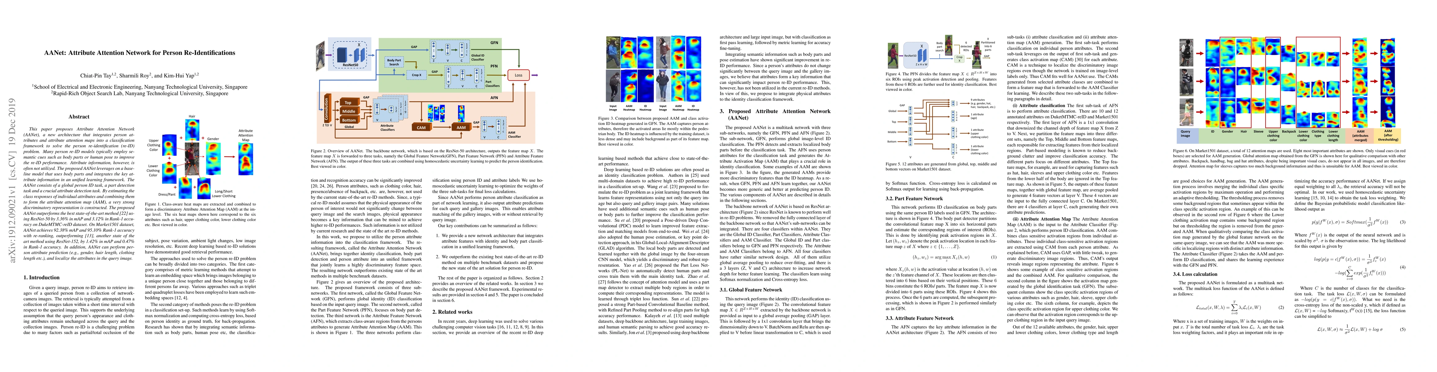 The AANet integrates person attributes and attribute attention maps into a classification framework to enhance person re-identification performance, outperforming existing methods on DukeMTMC-reID and Market1501 datasets by achieving significant improvements in mAP and Rank-1 accuracy. Additionally, it can predict and localize person attributes.