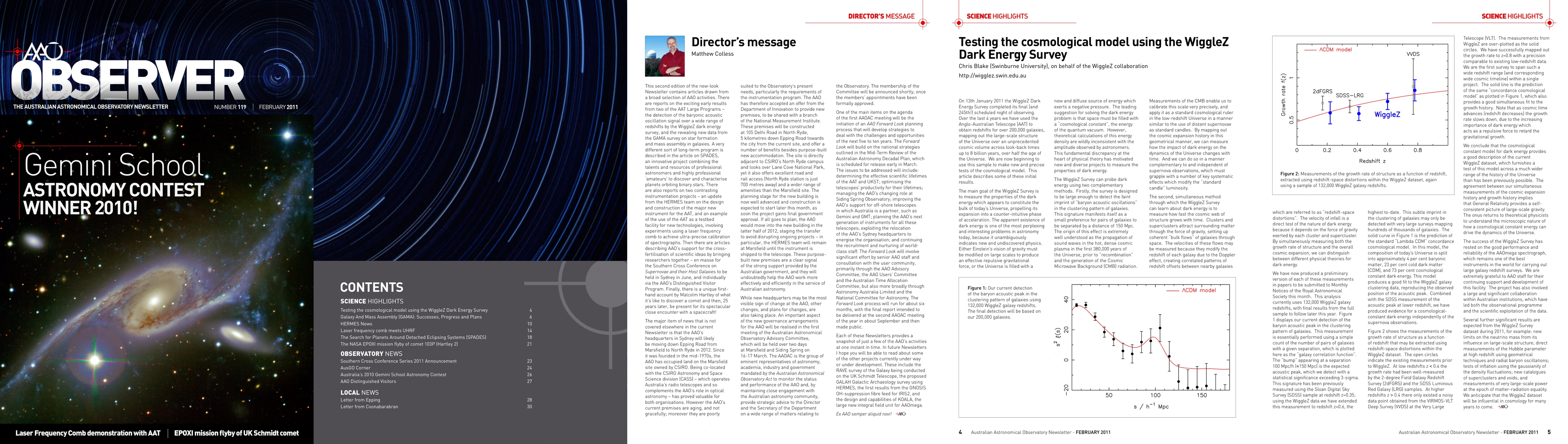 This edition of the Australian Astronomical Observatory Observer contains articles on the detection of the baryonic acoustic oscillation signal over a wide range of redshifts by the WiggleZ dark energy survey; results and future plans for the Galaxy And Mass Assembly survey; an update on the HERMES instrument; a report on the use of the AAT as a testbed for experiments using a laser frequency comb to achieve ultra-precise calibration of spectrographs; an innovative project combining professional astronomers and highly professional 'amateurs' to discover and characterise planets orbiting binary stars and finding out what it's like to be present when the comet you discovered encounters a spacecraft! The AAO's Distinguished Visitors for 2011 are introduced and an announcement is made for the upcoming Southern Cross Conference on 'Supernovae and their Host Galaxies' to be held in Sydney in June 2011.