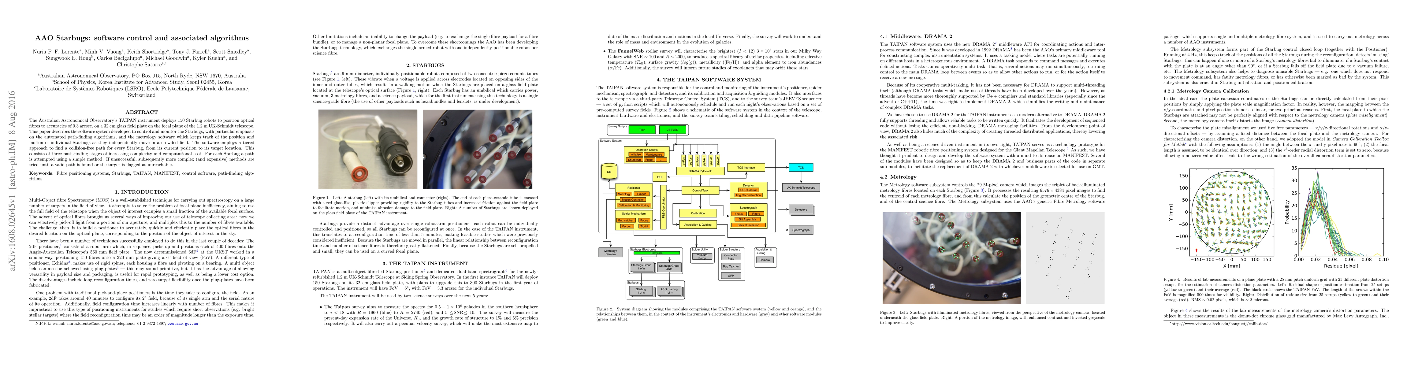 The paper details the software system controlling 150 Starbug robots for positioning optical fibres on the TAIPAN instrument, emphasizing automated path-finding algorithms and metrology software. The software employs a tiered approach with three stages of increasing complexity to find collision-free paths for each Starbug.