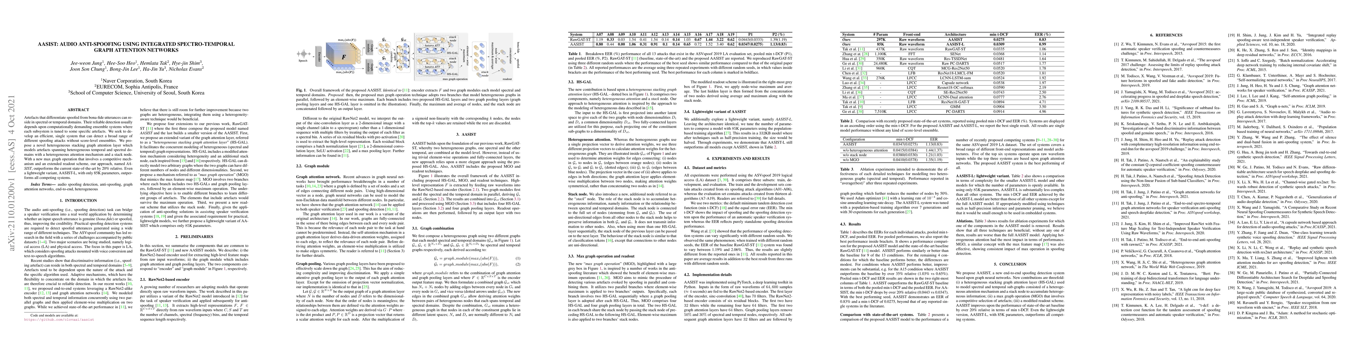 AASIST proposes an efficient single system for audio anti-spoofing using a novel heterogeneous stacking graph attention network that models spectral and temporal artefacts, achieving a 20% relative improvement over state-of-the-art methods, even a lightweight variant with 85K parameters.