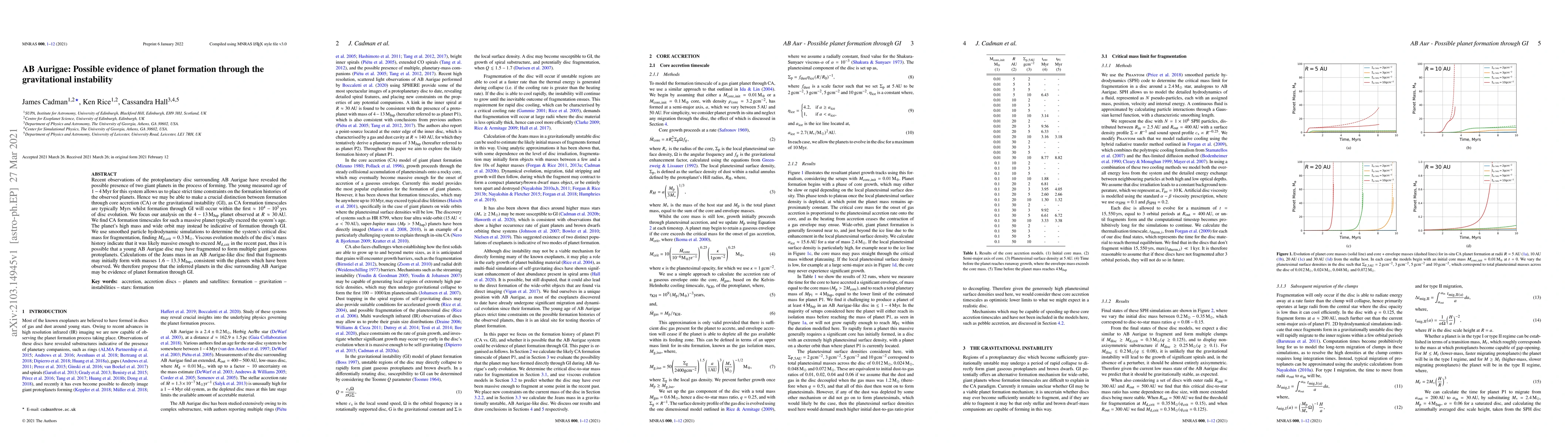 Recent observations suggest two giant planets in the AB Aurigae system may form via gravitational instability rather than core accretion. Simulations indicate the disc was likely massive enough to fragment, supporting the hypothesis of planet formation through gravitational instability.