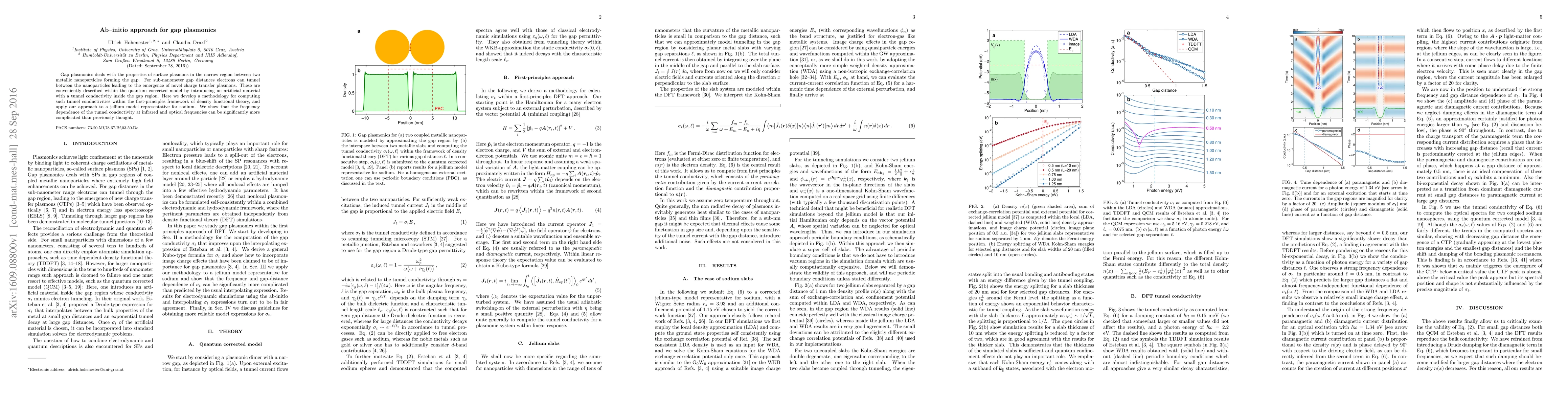 Gap plasmonics deals with the properties of surface plasmons in the narrow region between two metallic nanoparticles forming the gap. For sub-nanometer gap distances electrons can tunnel between the nanoparticles leading to the emergence of novel charge transfer plasmons. These are conveniently described within the quantum corrected model by introducing an artificial material with a tunnel conductivity inside the gap region. Here we develop a methodology for computing such tunnel conductivities within the first-principles framework of density functional theory, and apply our approach to a jellium model representative for sodium. We show that the frequency dependence of the tunnel conductivity at infrared and optical frequencies can be significantly more complicated than previously thought.