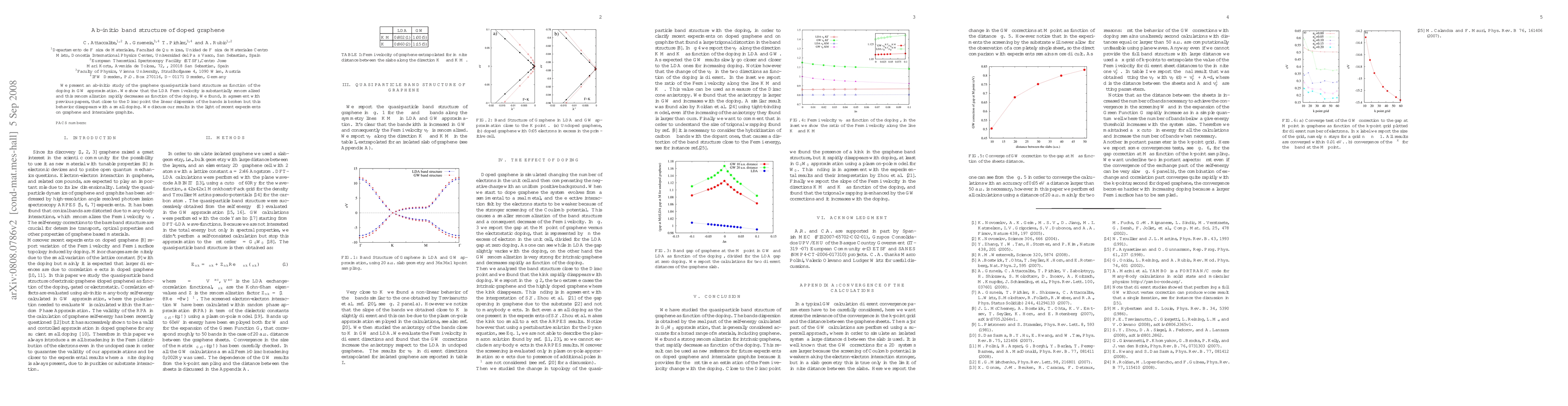 The paper presents a detailed ab-initio analysis of doped graphene's quasi-particle band structure, highlighting the renormalization of Fermi velocity and its anisotropy with doping.