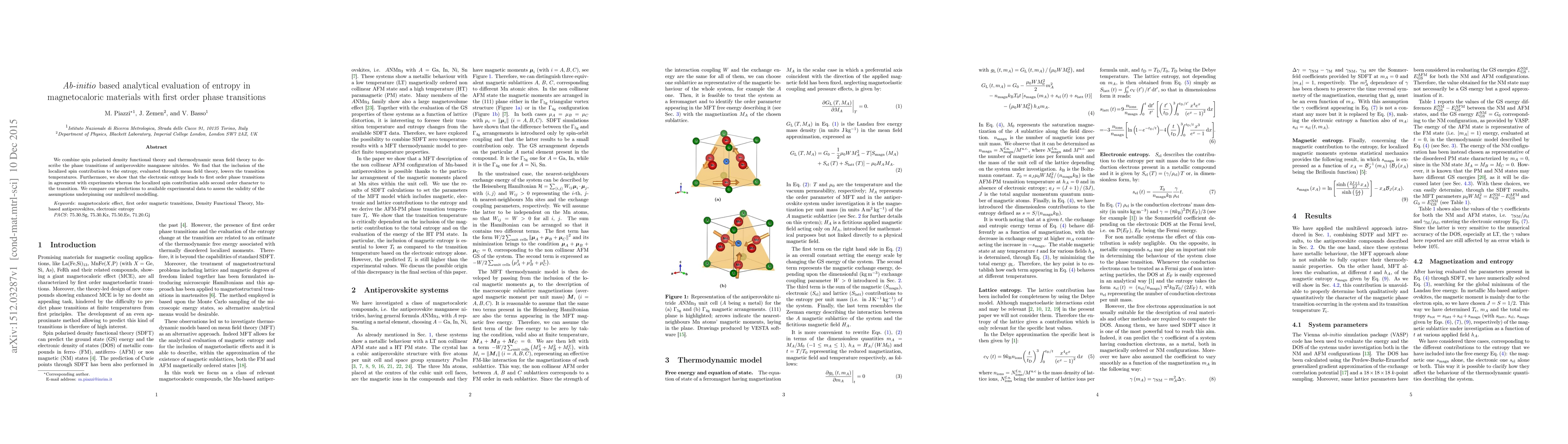 We combine spin polarised density functional theory and thermodynamic mean field theory to describe the phase transitions of antiperovskite manganese nitrides. We find that the inclusion of the localized spin contribution to the entropy, evaluated through mean field theory, lowers the transition temperatures. Furthermore, we show that the electronic entropy leads to first order phase transitions in agreement with experiments whereas the localized spin contribution adds second order character to the transition. We compare our predictions to available experimental data to assess the validity of the assumptions underpinning our multilevel modelling.